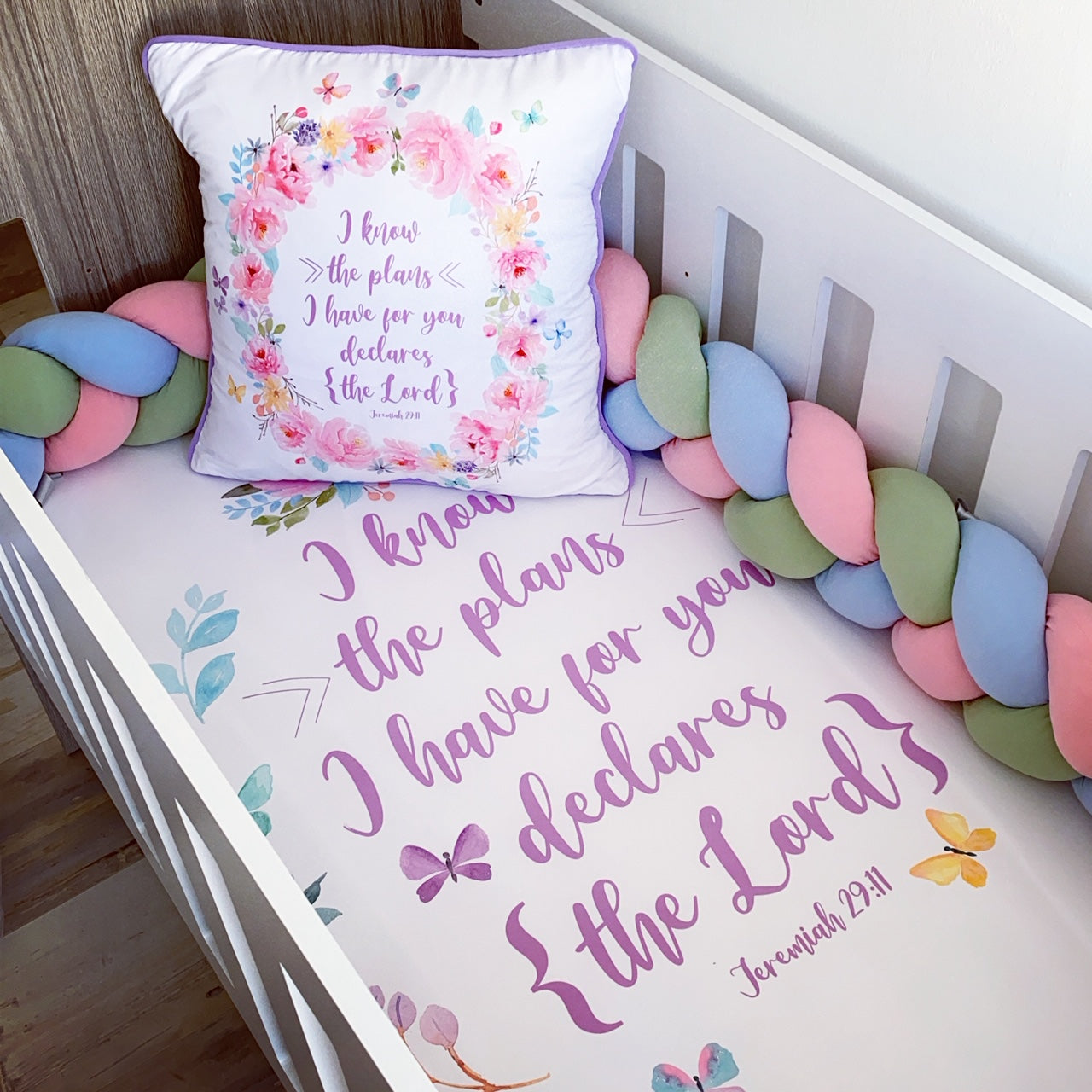 The Nursery Set: Standard Duvet Cover & Inner (80 x 110cm) | 2,5m Braided Bumper | Cot Pillow Cover & Inner | Scatter Cover & Inner | Name Pillow Cover & Inner | Change Mat Cover & Inner | Steel Frame or Wooden Frame | Set of 4 Dangles | White Fitted Sheet