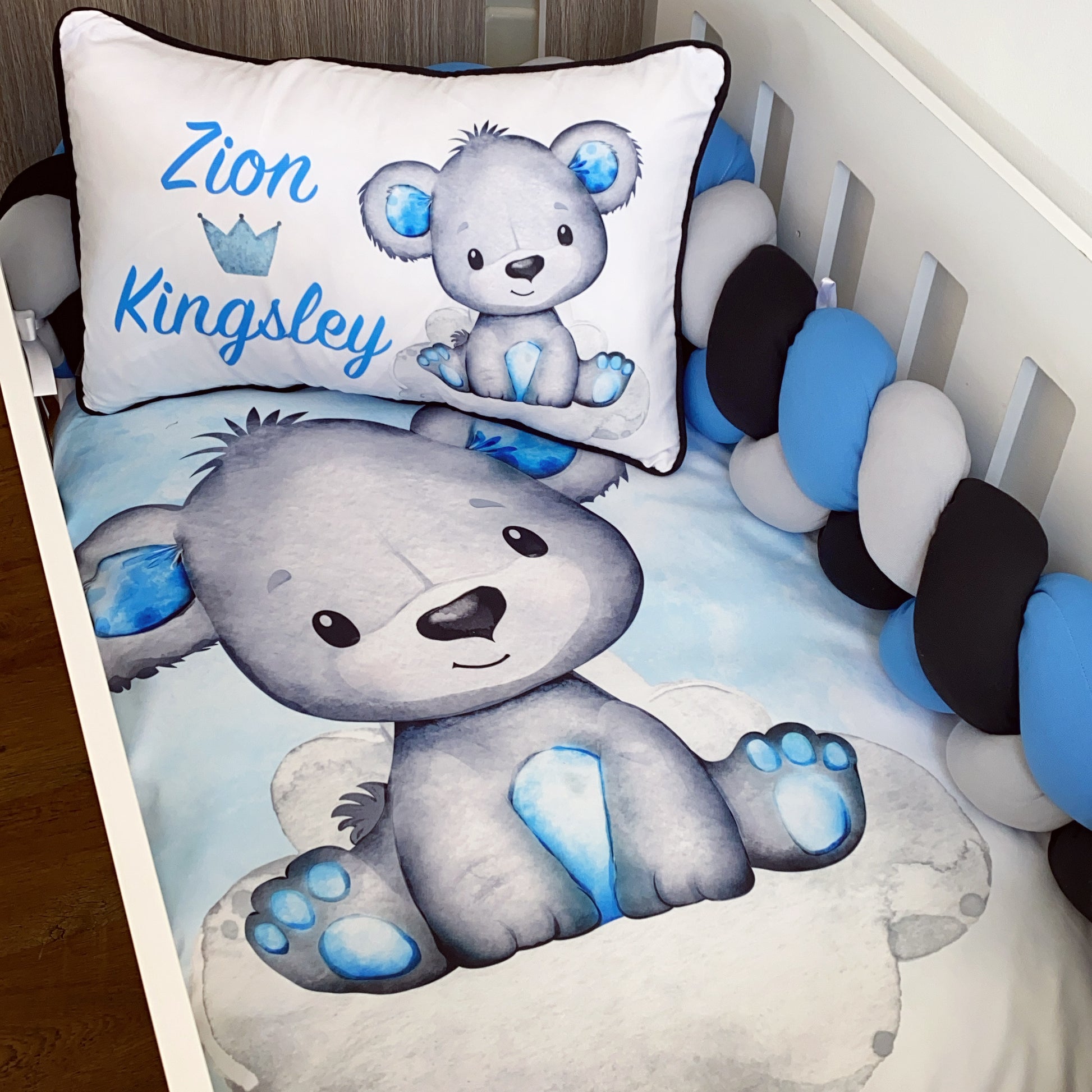 The Nursery Set: Standard Duvet Cover & Inner (80 x 110cm) | 2,5m Braided Bumper | Cot Pillow Cover & Inner | Scatter Cover & Inner | Name Pillow Cover & Inner | Change Mat Cover & Inner | Steel Frame or Wooden Frame | Set of 4 Dangles | White Fitted Sheet