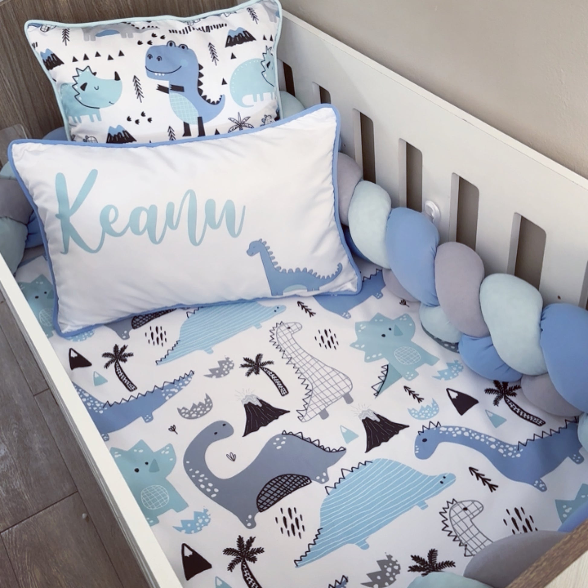 The Nursery Set: Standard Duvet Cover & Inner (80 x 110cm) | 2,5m Braided Bumper | Cot Pillow Cover & Inner | Scatter Cover & Inner | Name Pillow Cover & Inner | Change Mat Cover & Inner | Steel Frame or Wooden Frame | Set of 4 Dangles | White Fitted Sheet