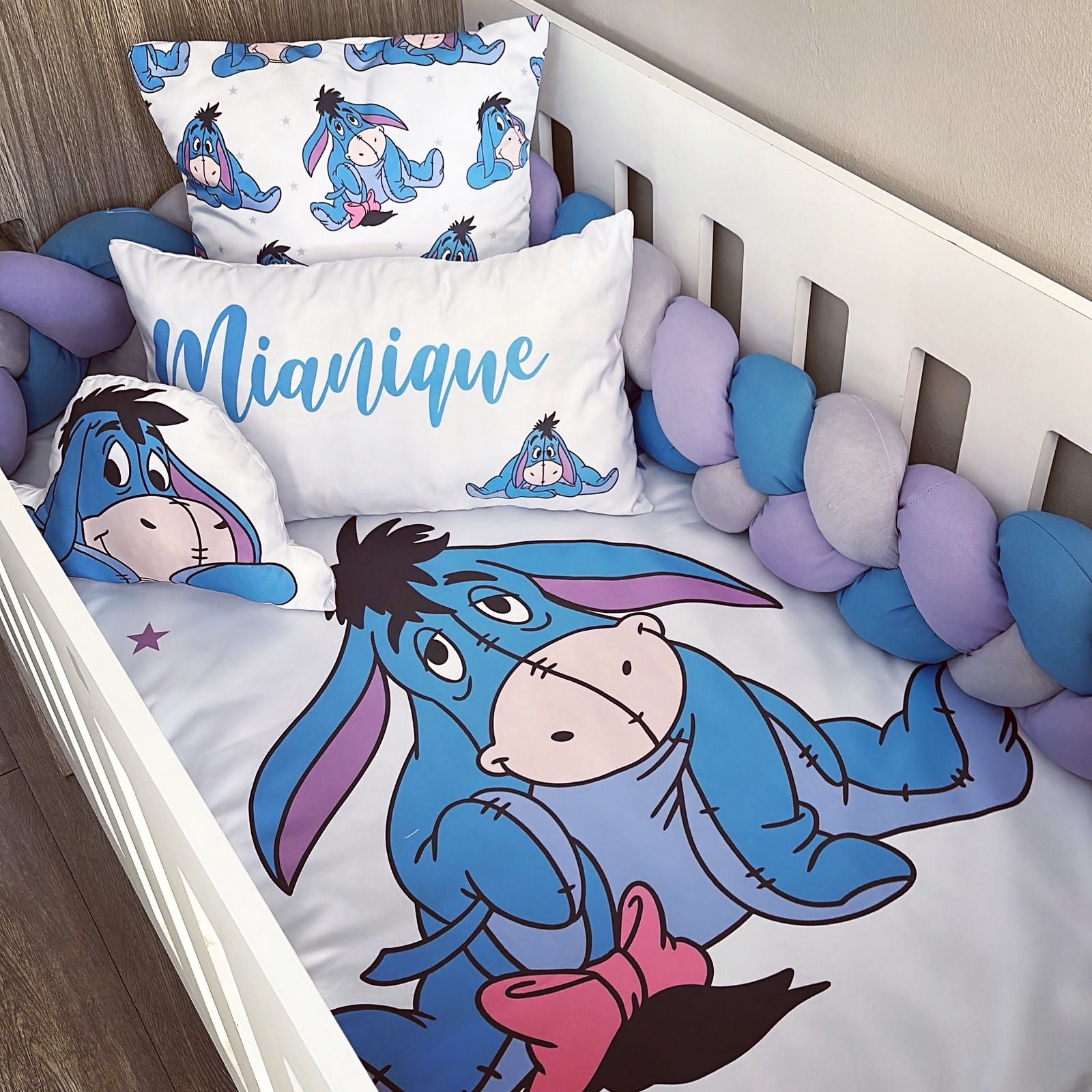 The Nursery Set: Standard Duvet Cover & Inner (80 x 110cm) | 2,5m Braided Bumper | Cot Pillow Cover & Inner | Scatter Cover & Inner | Name Pillow Cover & Inner | Change Mat Cover & Inner | Steel Frame or Wooden Frame | Set of 4 Dangles | White Fitted Sheet
