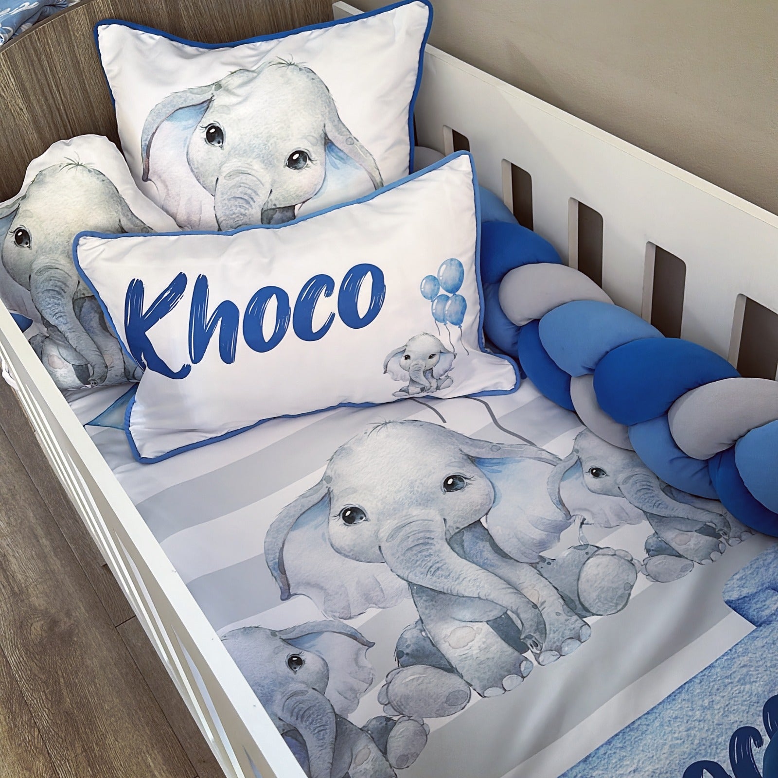 The Nursery Set: Standard Duvet Cover & Inner (80 x 110cm) | 2,5m Braided Bumper | Cot Pillow Cover & Inner | Scatter Cover & Inner | Name Pillow Cover & Inner | Change Mat Cover & Inner | Steel Frame or Wooden Frame | Set of 4 Dangles | White Fitted Sheet