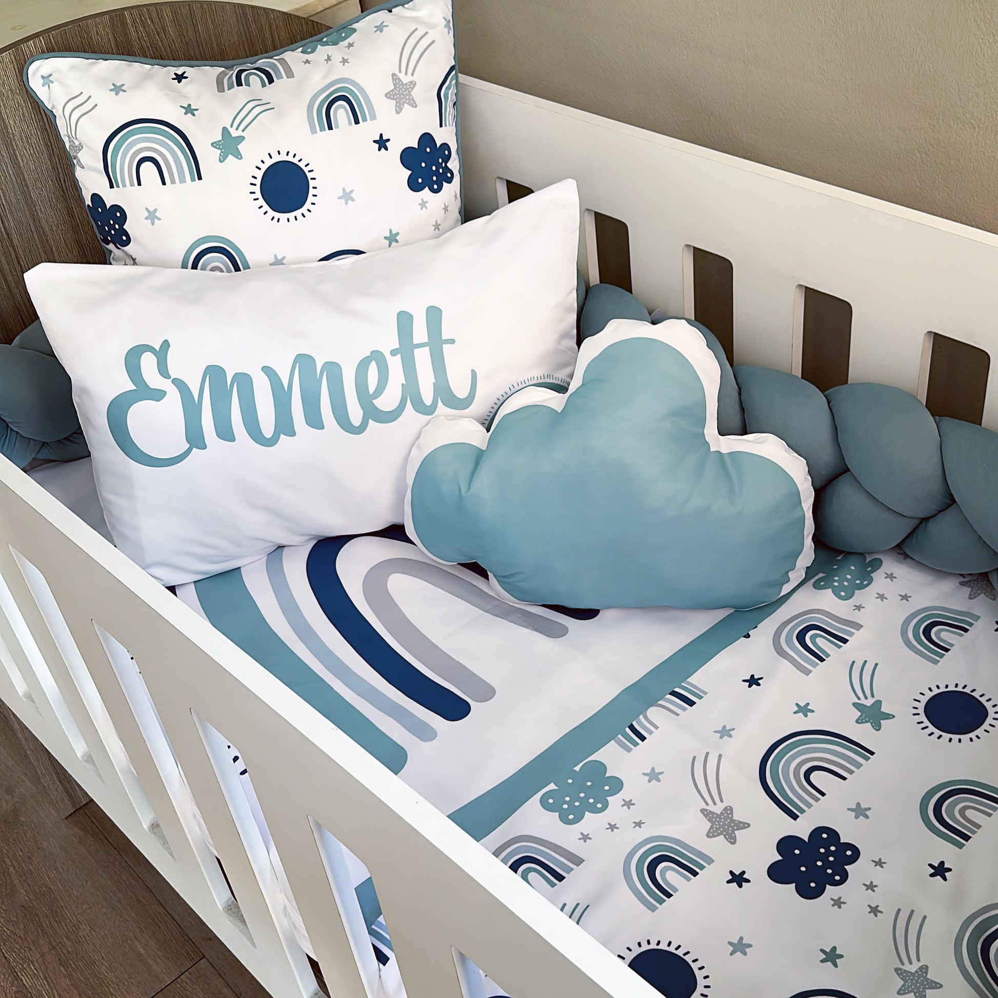 The Standard Set: Standard Duvet Cover & Inner (80 x 110cm) | 2,5m Braided Bumper | Cot Pillow Cover & Inner | Scatter Cover & Inner | Name Pillow Cover & Inner | White Fitted Sheet