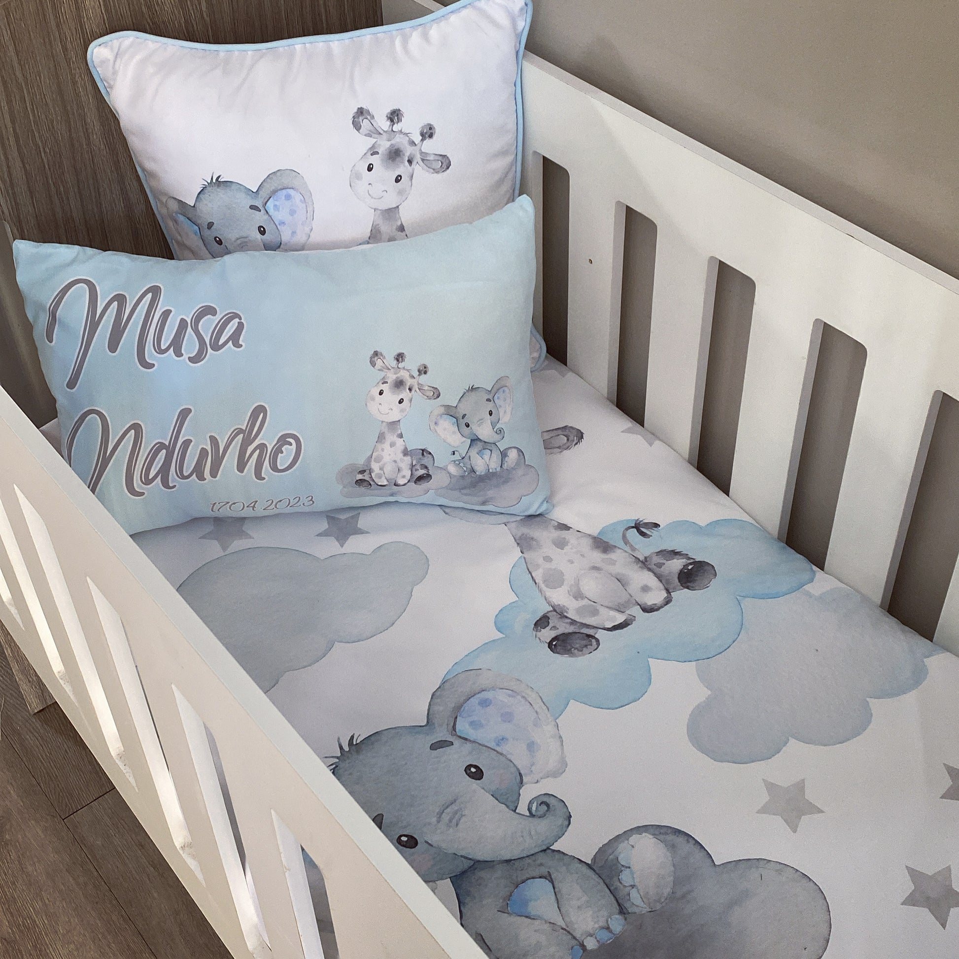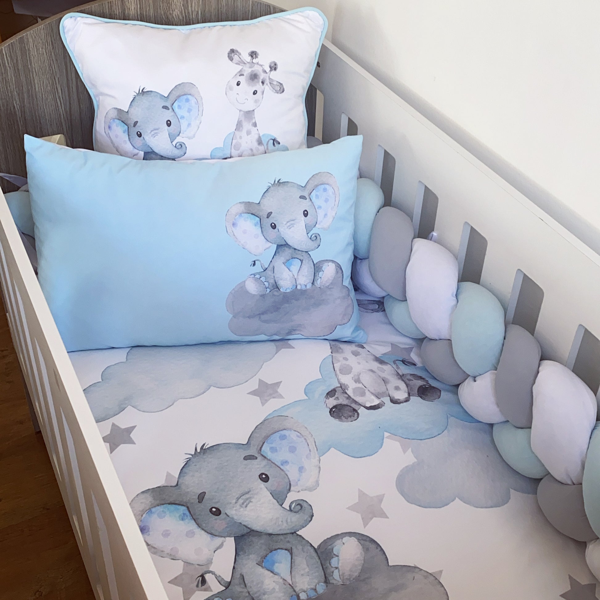 The Nursery Set: Standard Duvet Cover & Inner (80 x 110cm) | 2,5m Braided Bumper | Cot Pillow Cover & Inner | Scatter Cover & Inner | Name Pillow Cover & Inner | Change Mat Cover & Inner | Steel Frame or Wooden Frame | Set of 4 Dangles | White Fitted Sheet