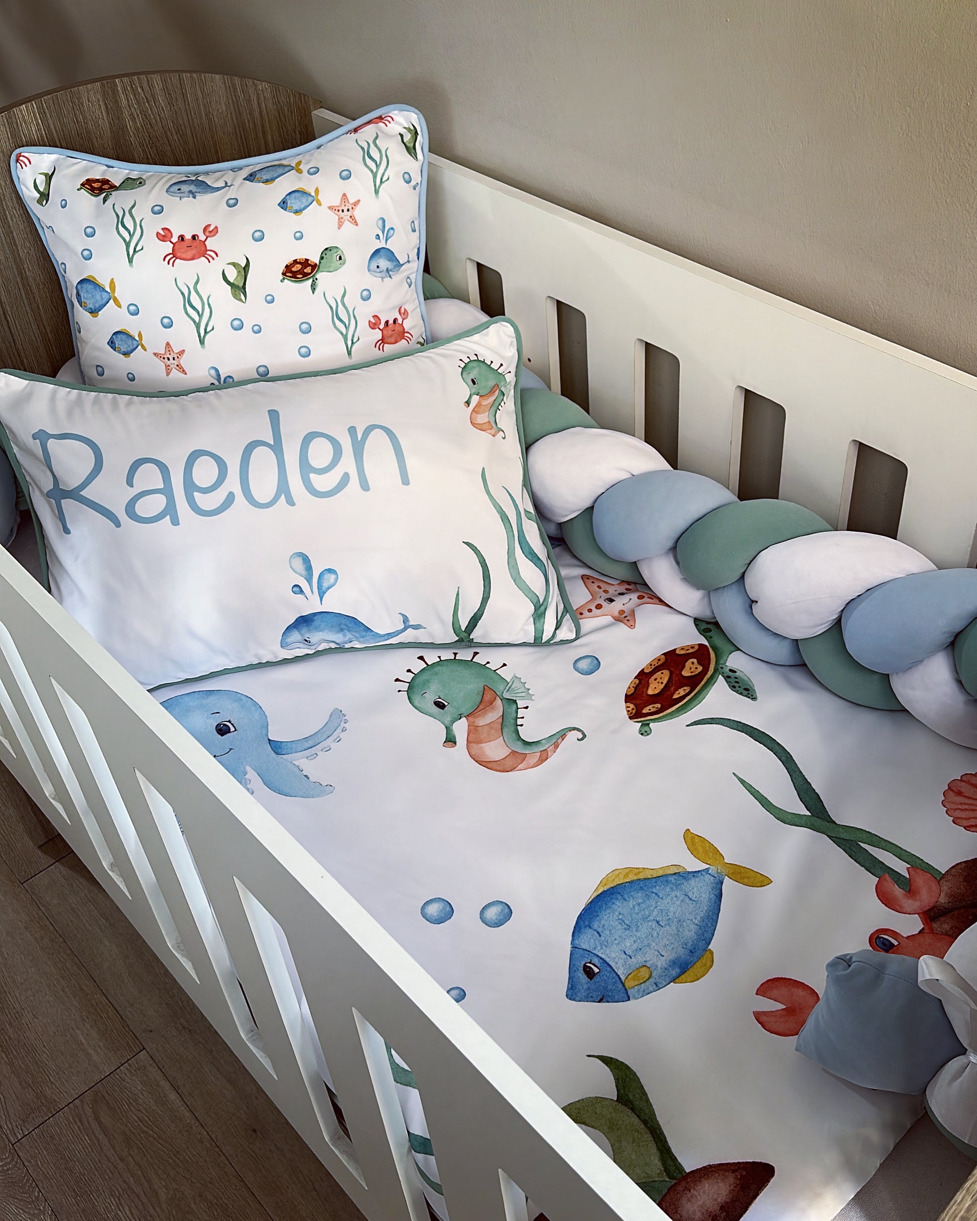 The Standard Set: Standard Duvet Cover & Inner (80 x 110cm) | 2,5m Braided Bumper | Cot Pillow Cover & Inner | Scatter Cover & Inner | Name Pillow Cover & Inner | White Fitted Sheet