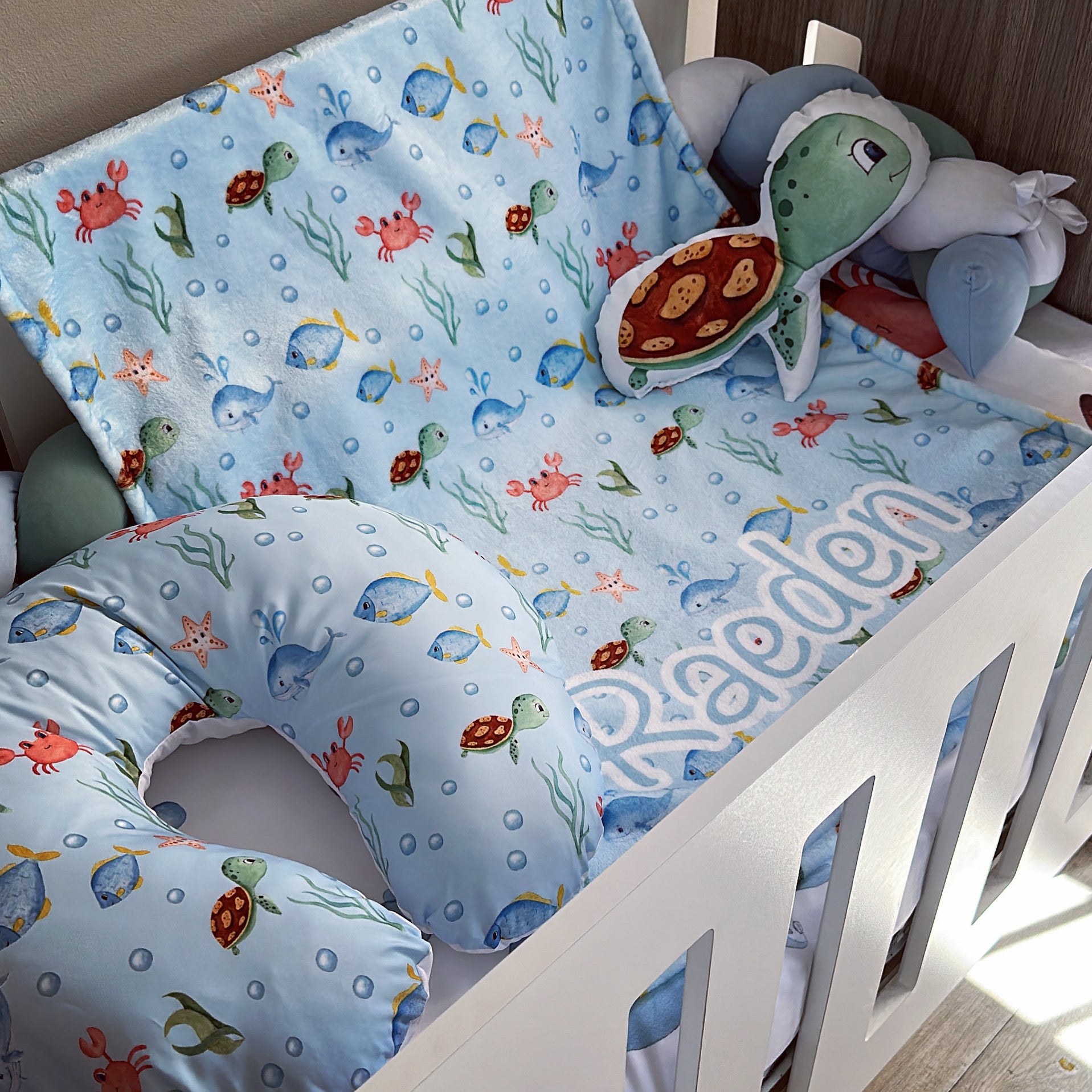 The Co-Sleeper Cot Set: 2 x Fitted Sheets (1 x Plain & 1 x Printed) | Blanket 70 x 100cm | Cot Pillow Cover 7 Inner | Small Name Pillow Cover & Inner