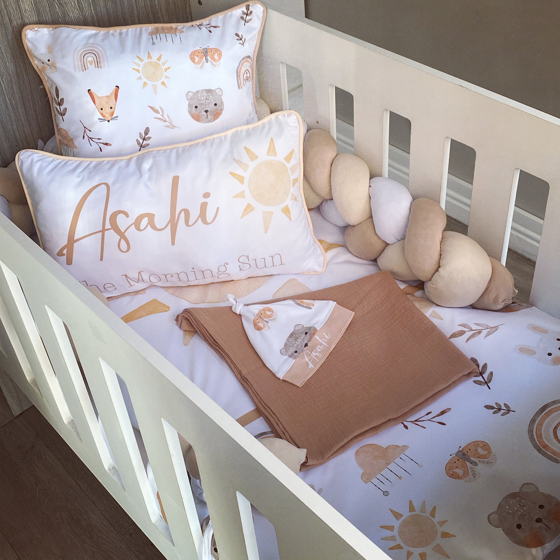 The Standard Set: Standard Duvet Cover & Inner (80 x 110cm) | 2,5m Braided Bumper | Cot Pillow Cover & Inner | Scatter Cover & Inner | Name Pillow Cover & Inner | White Fitted Sheet