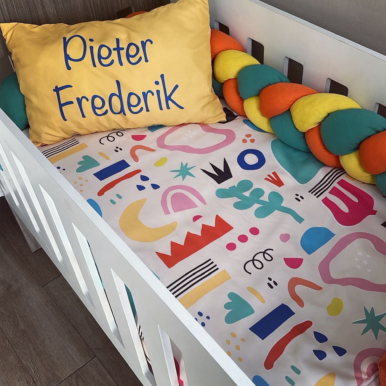 The Standard Set: Standard Duvet Cover & Inner (80 x 110cm) | 2,5m Braided Bumper | Cot Pillow Cover & Inner | Scatter Cover & Inner | Name Pillow Cover & Inner | White Fitted Sheet