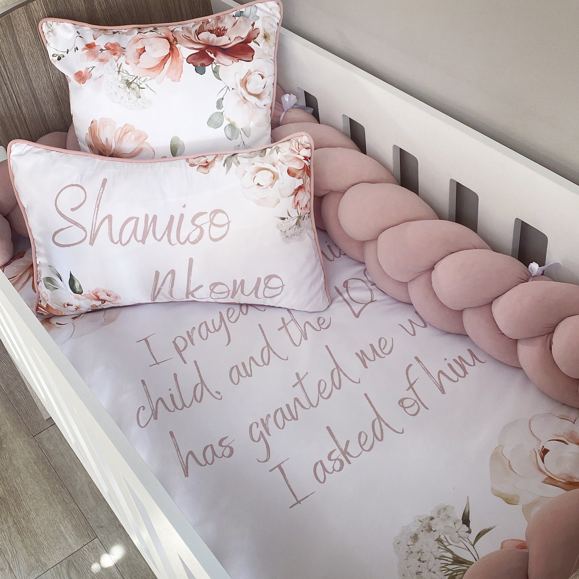 The Nursery Set: Standard Duvet Cover & Inner (80 x 110cm) | 2,5m Braided Bumper | Cot Pillow Cover & Inner | Scatter Cover & Inner | Name Pillow Cover & Inner | Change Mat Cover & Inner | Steel Frame or Wooden Frame | Set of 4 Dangles | White Fitted Sheet