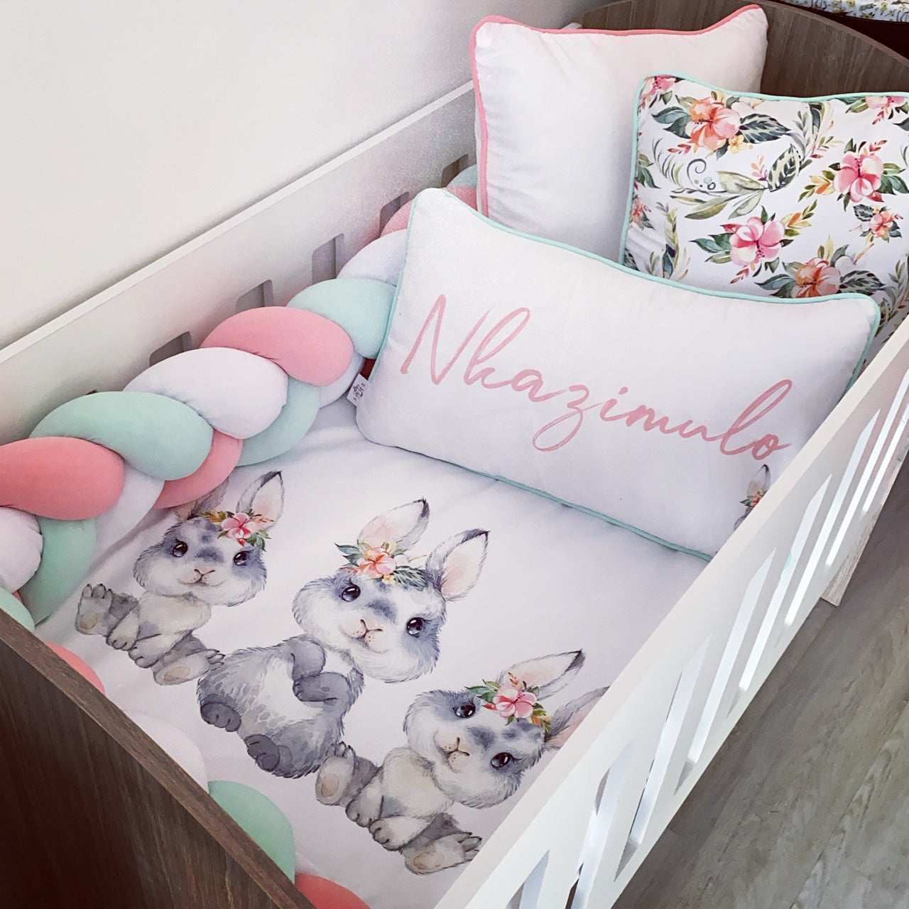 The Nursery Set: Standard Duvet Cover & Inner (80 x 110cm) | 2,5m Braided Bumper | Cot Pillow Cover & Inner | Scatter Cover & Inner | Name Pillow Cover & Inner | Change Mat Cover & Inner | Steel Frame or Wooden Frame | Set of 4 Dangles | White Fitted Sheet