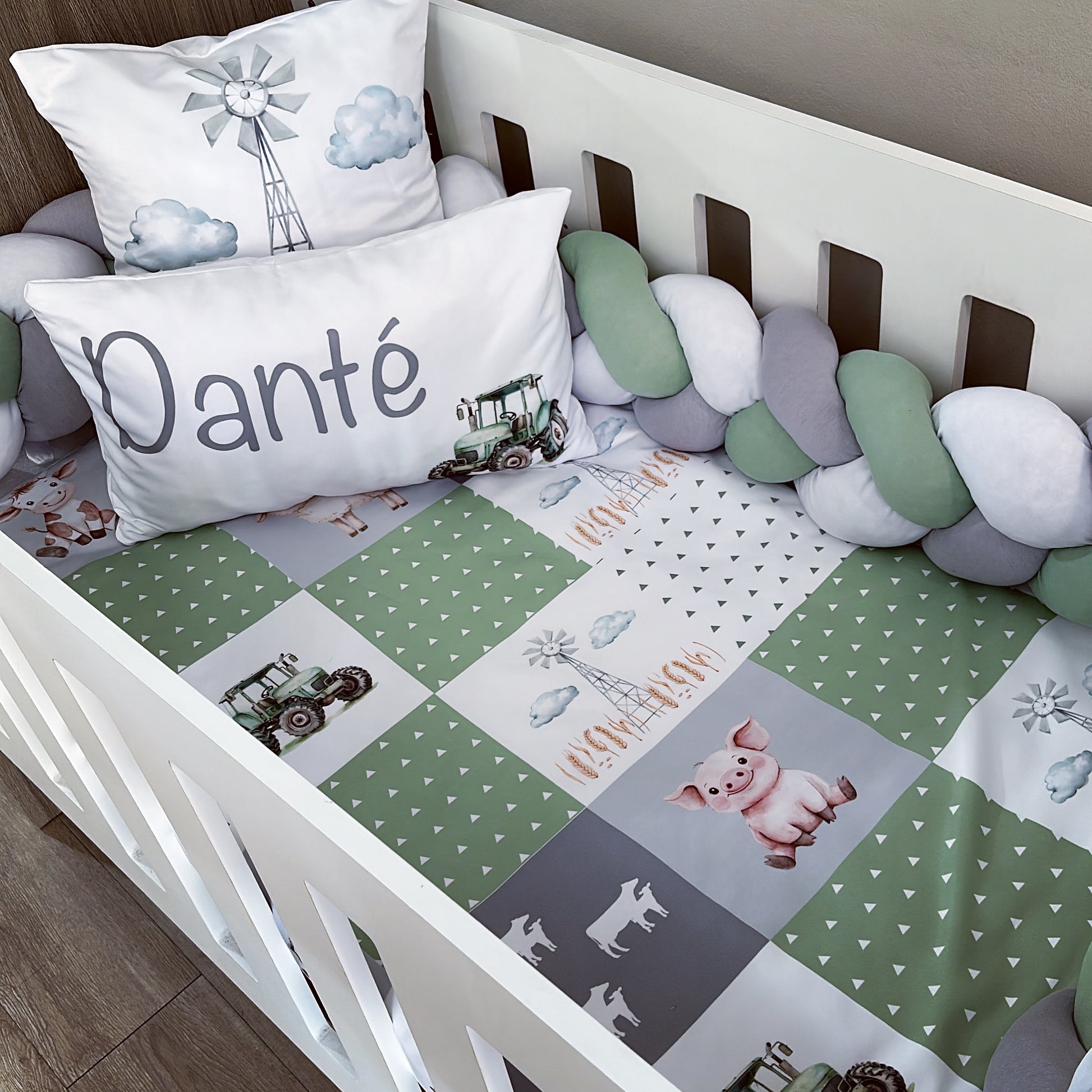 The Nursery Set: Standard Duvet Cover & Inner (80 x 110cm) | 2,5m Braided Bumper | Cot Pillow Cover & Inner | Scatter Cover & Inner | Name Pillow Cover & Inner | Change Mat Cover & Inner | Steel Frame or Wooden Frame | Set of 4 Dangles | White Fitted Sheet