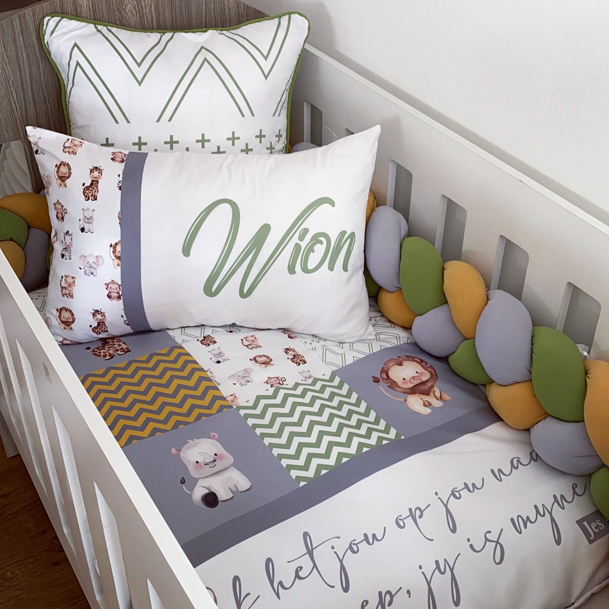 The Nursery Set: Standard Duvet Cover & Inner (80 x 110cm) | 2,5m Braided Bumper | Cot Pillow Cover & Inner | Scatter Cover & Inner | Name Pillow Cover & Inner | Change Mat Cover & Inner | Steel Frame or Wooden Frame | Set of 4 Dangles | White Fitted Sheet