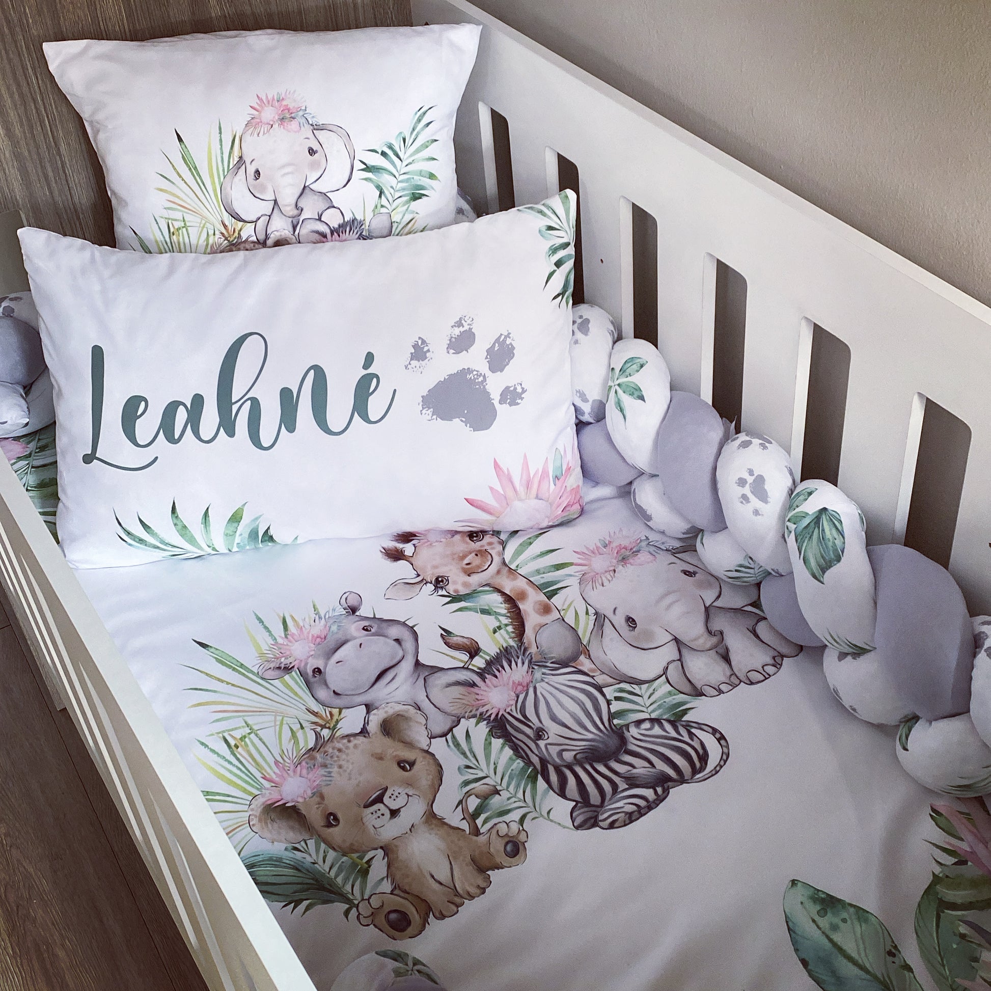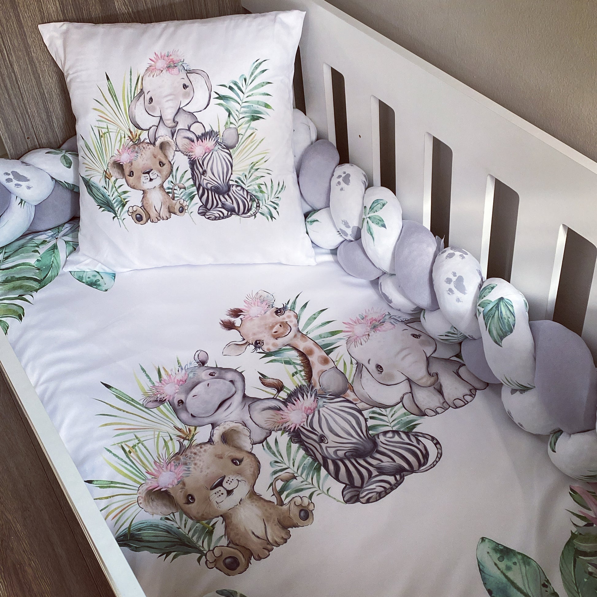 The Nursery Set: Standard Duvet Cover & Inner (80 x 110cm) | 2,5m Braided Bumper | Cot Pillow Cover & Inner | Scatter Cover & Inner | Name Pillow Cover & Inner | Change Mat Cover & Inner | Steel Frame or Wooden Frame | Set of 4 Dangles | White Fitted Sheet