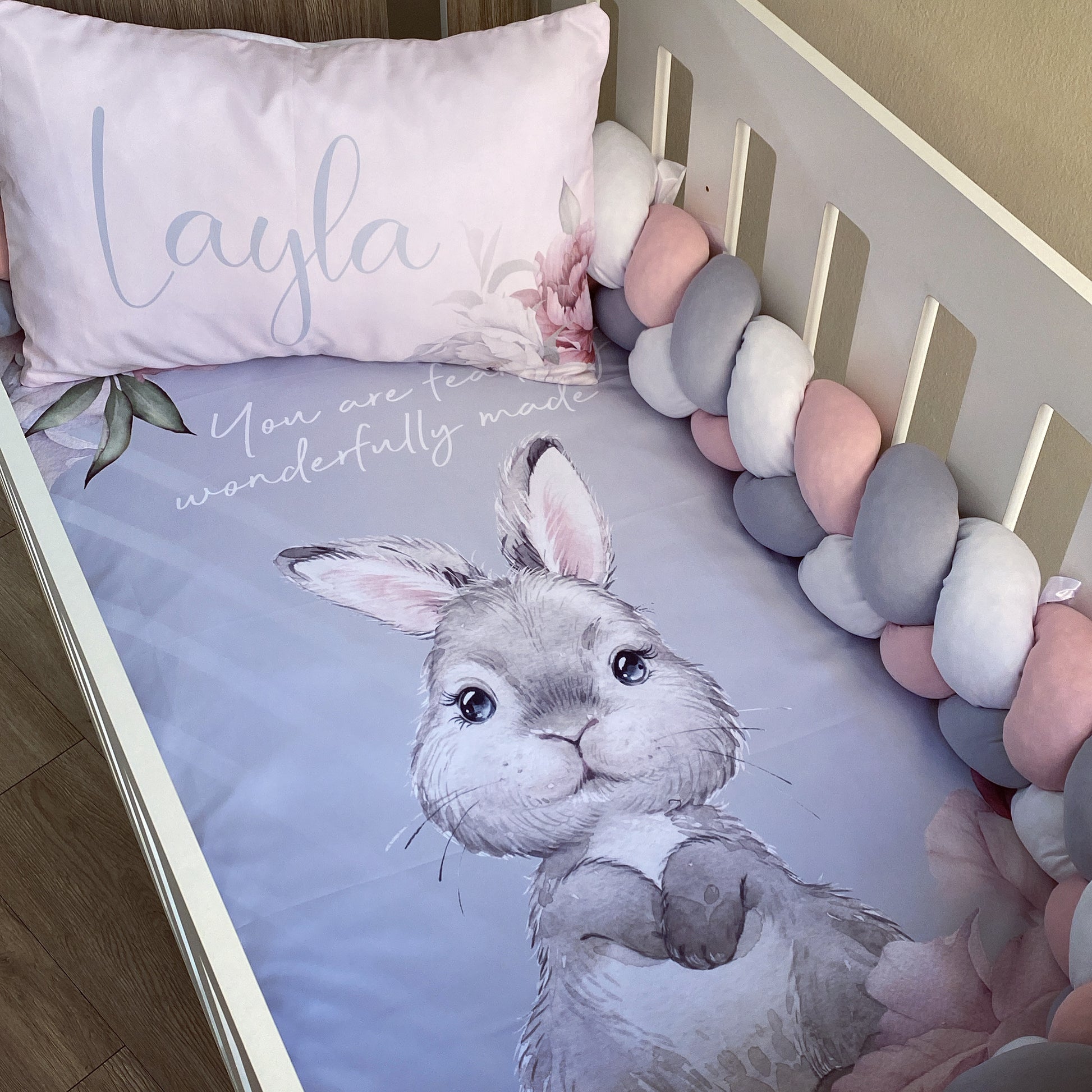 The Nursery Set: Standard Duvet Cover & Inner (80 x 110cm) | 2,5m Braided Bumper | Cot Pillow Cover & Inner | Scatter Cover & Inner | Name Pillow Cover & Inner | Change Mat Cover & Inner | Steel Frame or Wooden Frame | Set of 4 Dangles | White Fitted Sheet