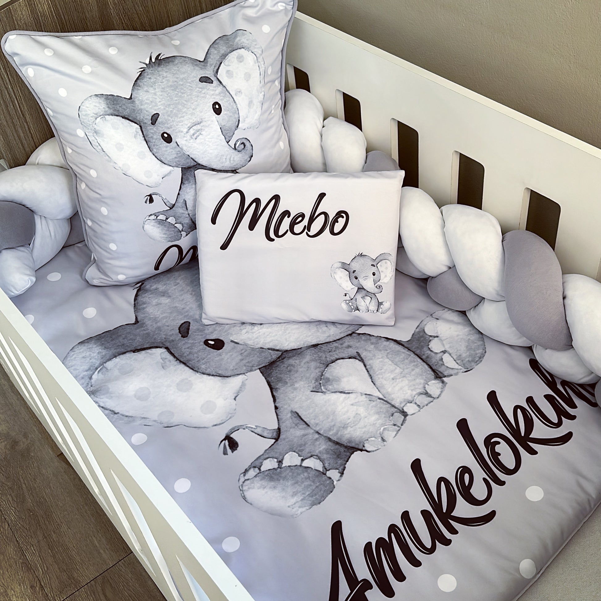 The Nursery Set: Standard Duvet Cover & Inner (80 x 110cm) | 2,5m Braided Bumper | Cot Pillow Cover & Inner | Scatter Cover & Inner | Name Pillow Cover & Inner | Change Mat Cover & Inner | Steel Frame or Wooden Frame | Set of 4 Dangles | White Fitted Sheet