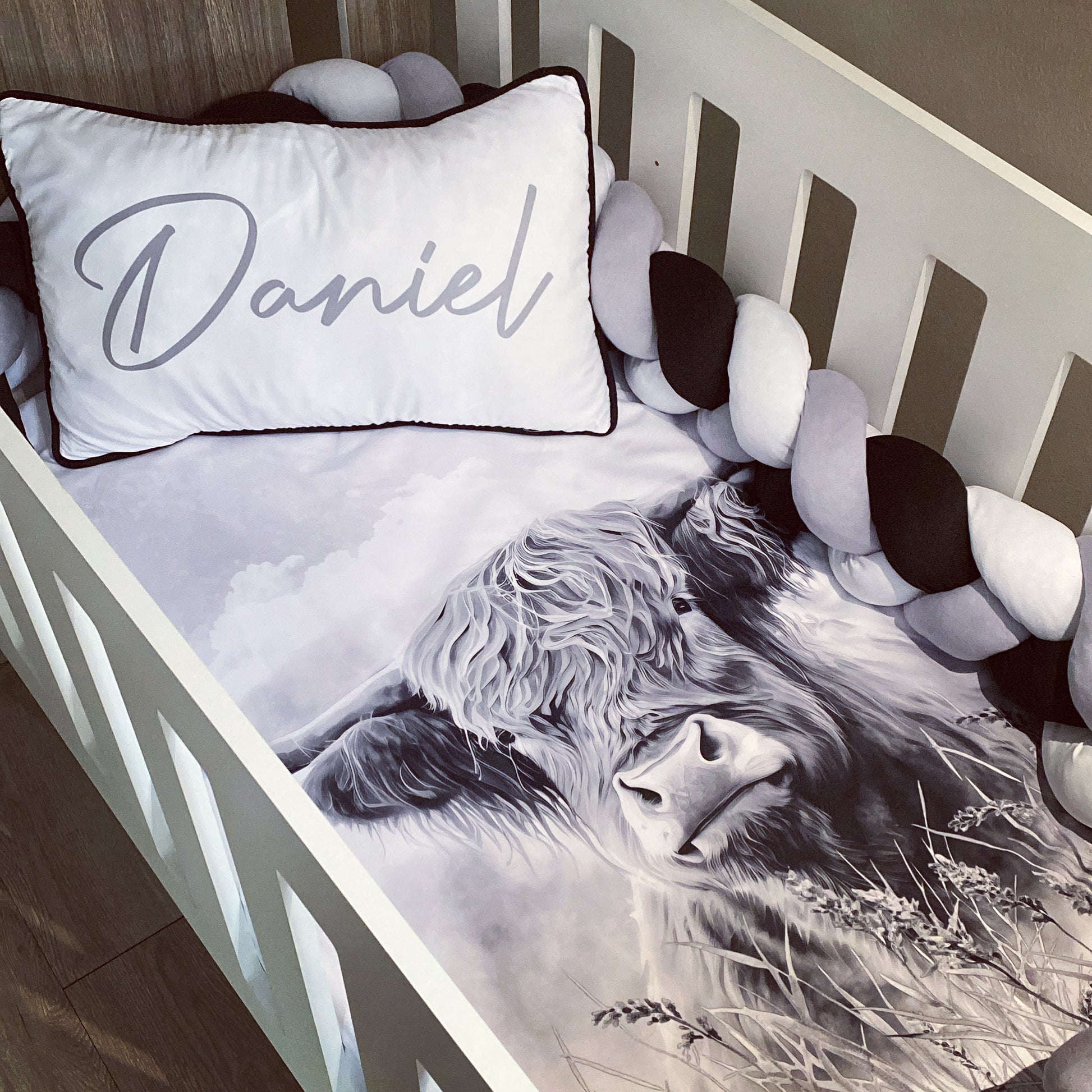 The Nursery Set: Standard Duvet Cover & Inner (80 x 110cm) | 2,5m Braided Bumper | Cot Pillow Cover & Inner | Scatter Cover & Inner | Name Pillow Cover & Inner | Change Mat Cover & Inner | Steel Frame or Wooden Frame | Set of 4 Dangles | White Fitted Sheet