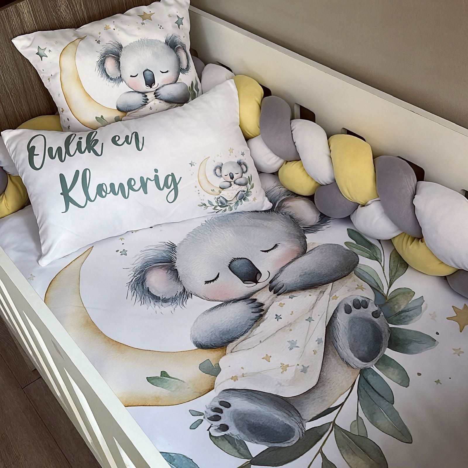 The Nursery Set: Standard Duvet Cover & Inner (80 x 110cm) | 2,5m Braided Bumper | Cot Pillow Cover & Inner | Scatter Cover & Inner | Name Pillow Cover & Inner | Change Mat Cover & Inner | Steel Frame or Wooden Frame | Set of 4 Dangles | White Fitted Sheet
