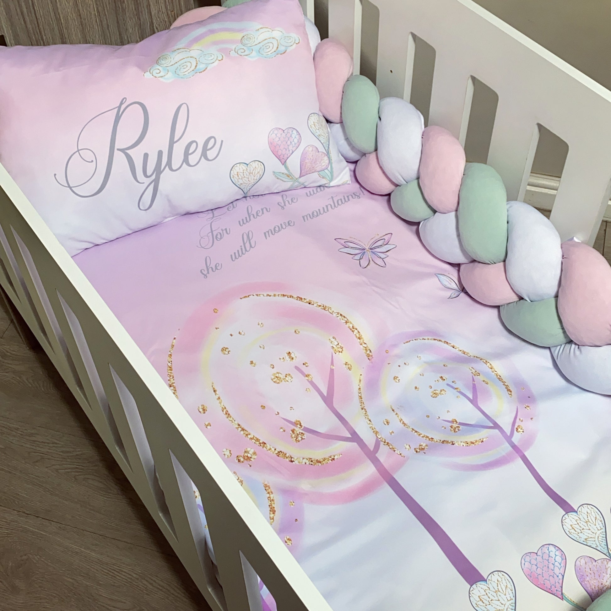 The Nursery Set: Standard Duvet Cover & Inner (80 x 110cm) | 2,5m Braided Bumper | Cot Pillow Cover & Inner | Scatter Cover & Inner | Name Pillow Cover & Inner | Change Mat Cover & Inner | Steel Frame or Wooden Frame | Set of 4 Dangles | White Fitted Sheet