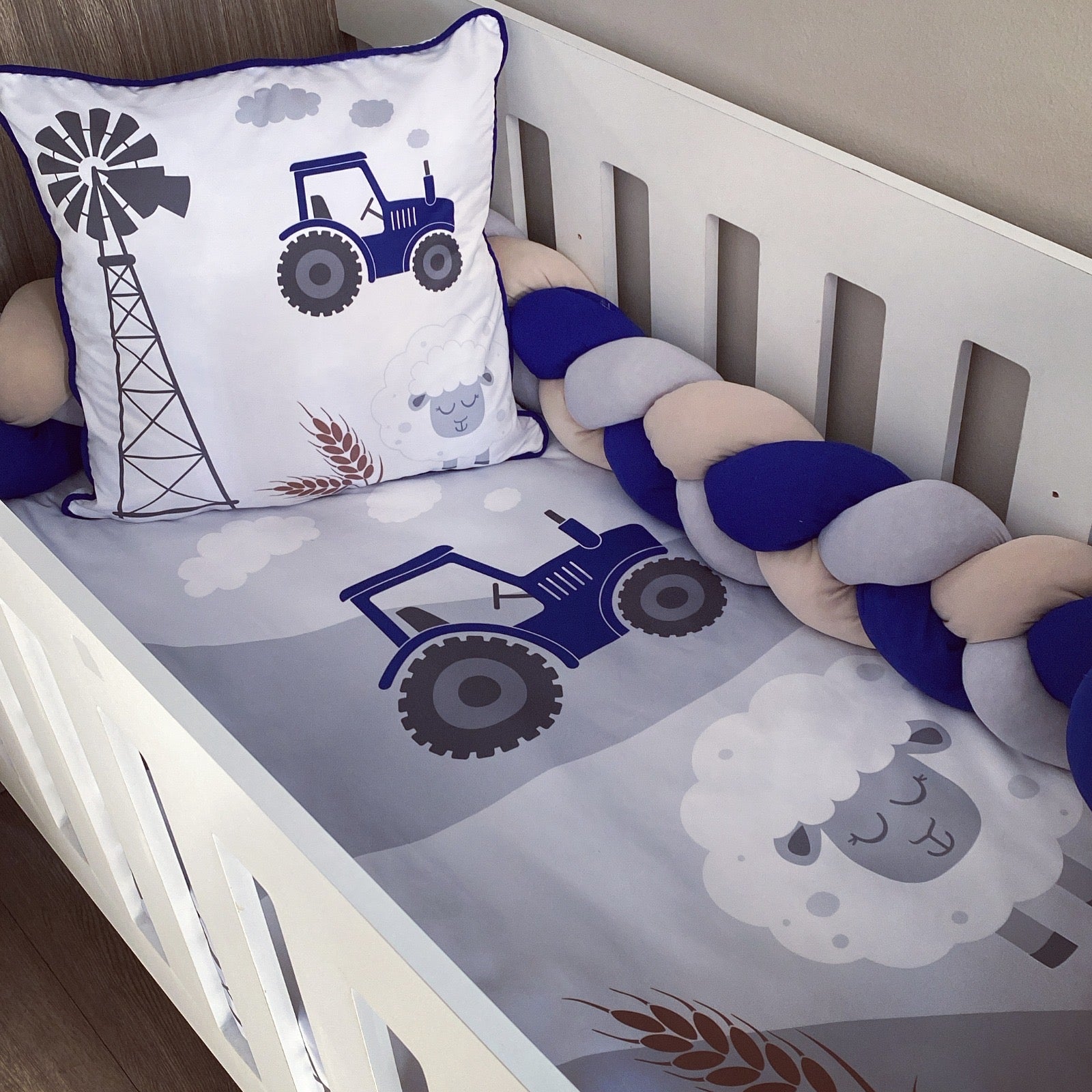 The Nursery Set: Standard Duvet Cover & Inner (80 x 110cm) | 2,5m Braided Bumper | Cot Pillow Cover & Inner | Scatter Cover & Inner | Name Pillow Cover & Inner | Change Mat Cover & Inner | Steel Frame or Wooden Frame | Set of 4 Dangles | White Fitted Sheet