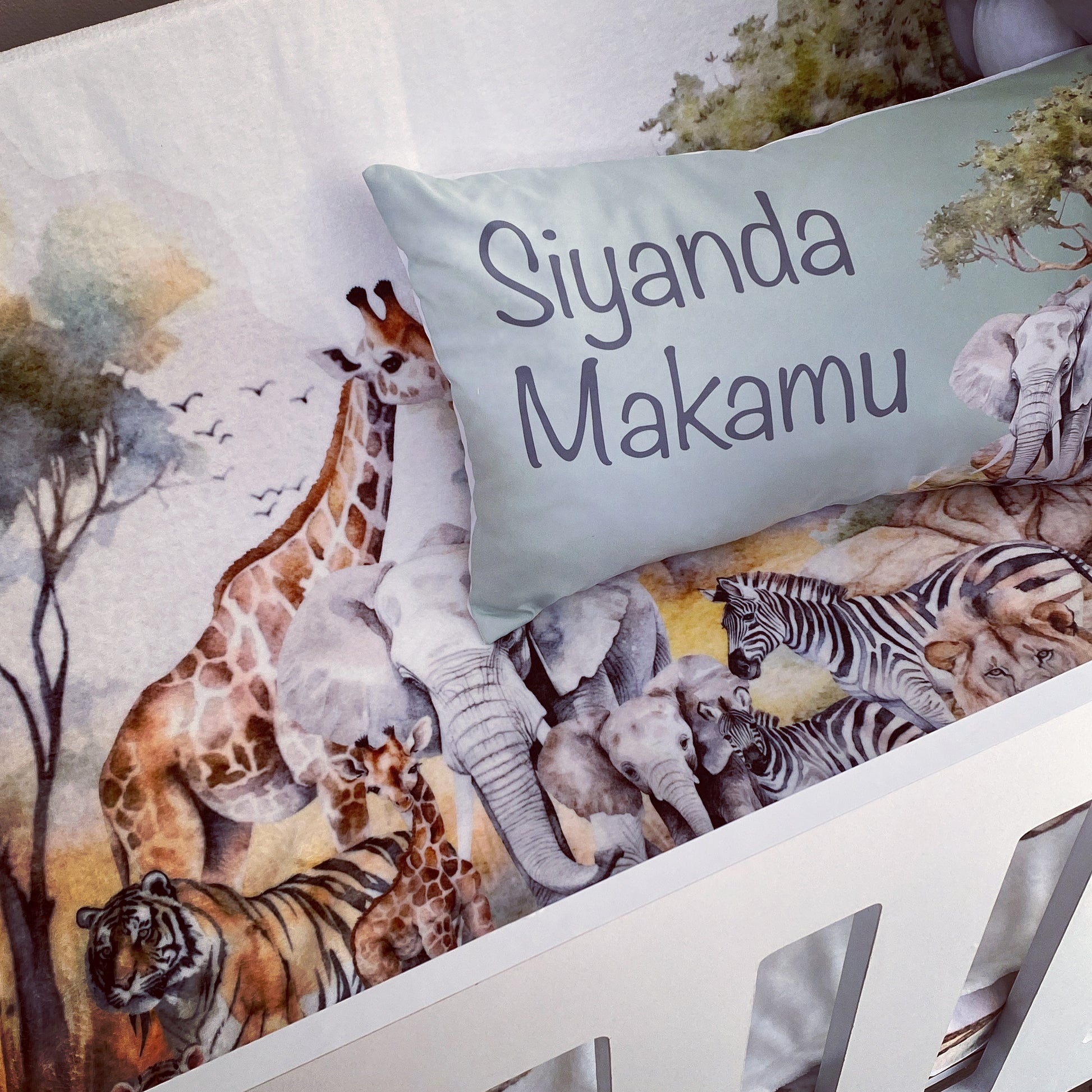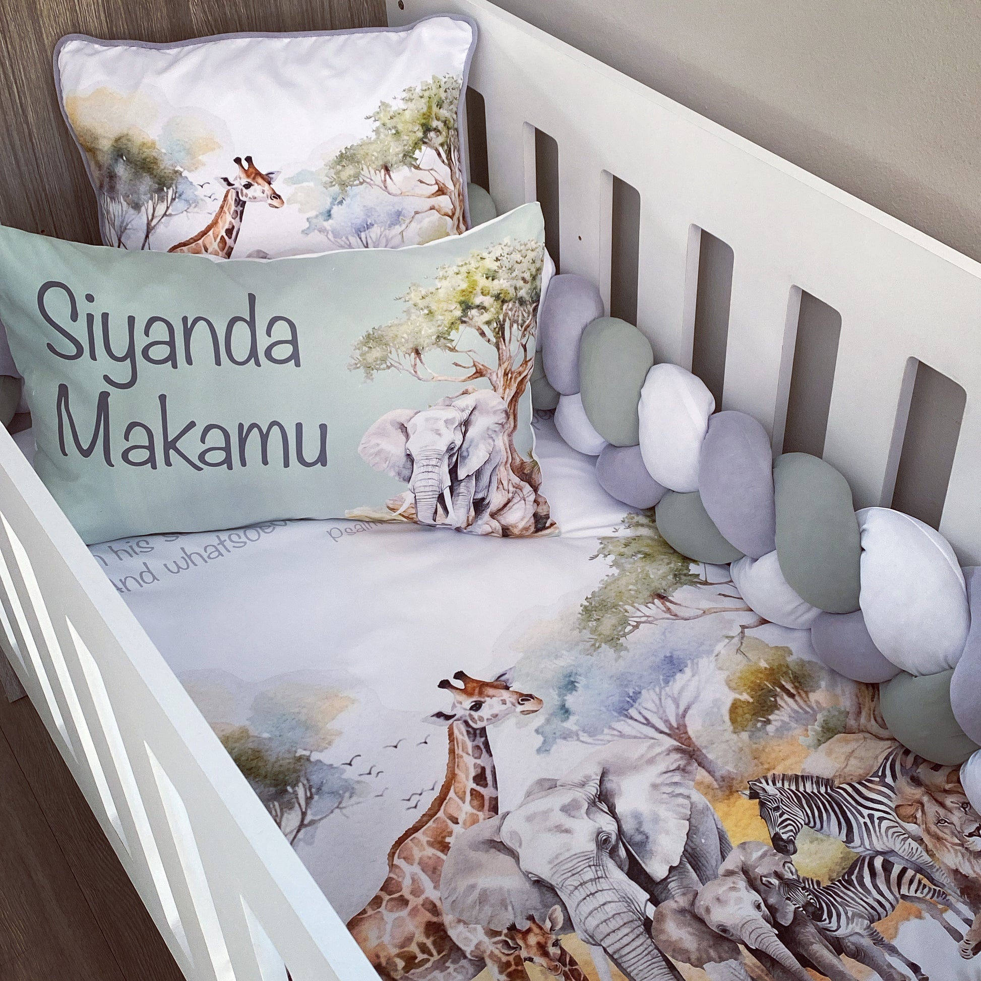 The Nursery Set: Standard Duvet Cover & Inner (80 x 110cm) | 2,5m Braided Bumper | Cot Pillow Cover & Inner | Scatter Cover & Inner | Name Pillow Cover & Inner | Change Mat Cover & Inner | Steel Frame or Wooden Frame | Set of 4 Dangles | White Fitted Sheet