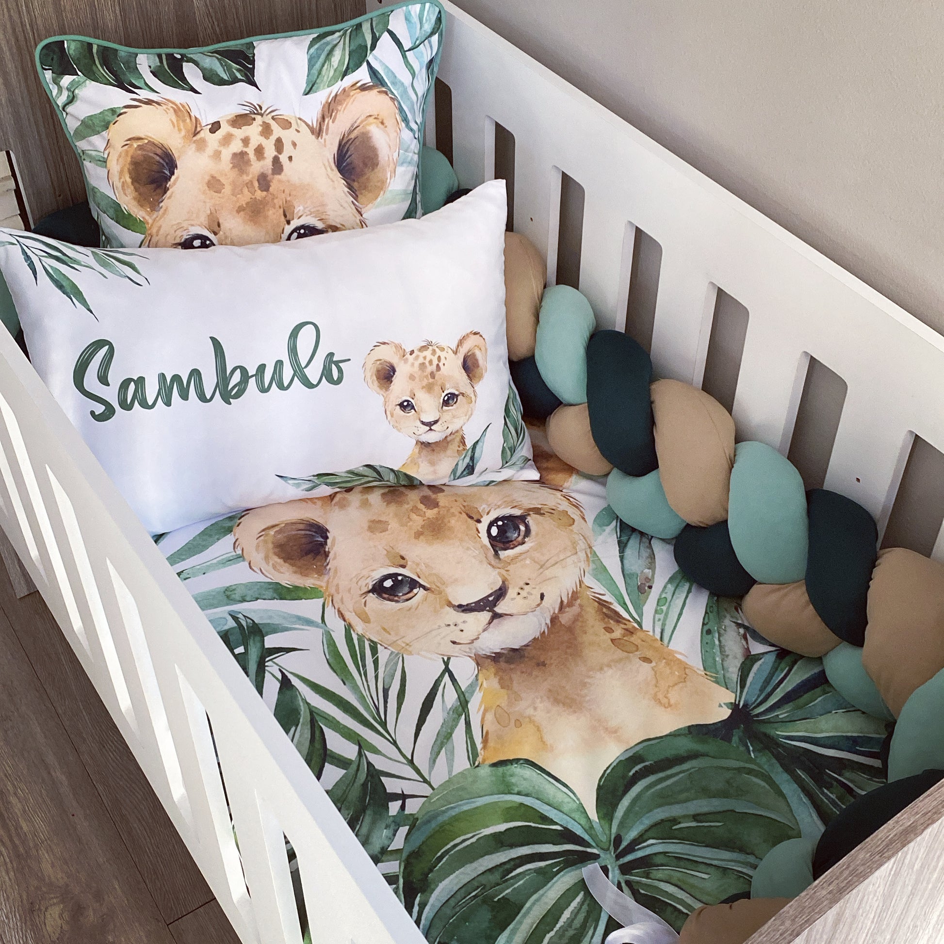 The Nursery Set: Standard Duvet Cover & Inner (80 x 110cm) | 2,5m Braided Bumper | Cot Pillow Cover & Inner | Scatter Cover & Inner | Name Pillow Cover & Inner | Change Mat Cover & Inner | Steel Frame or Wooden Frame | Set of 4 Dangles | White Fitted Sheet