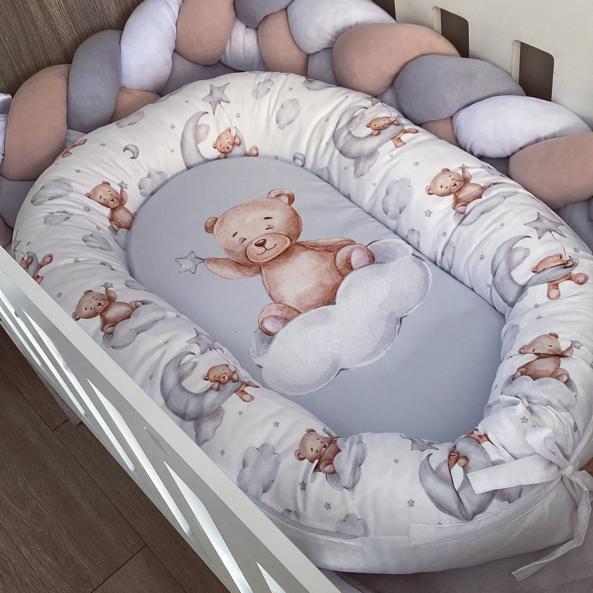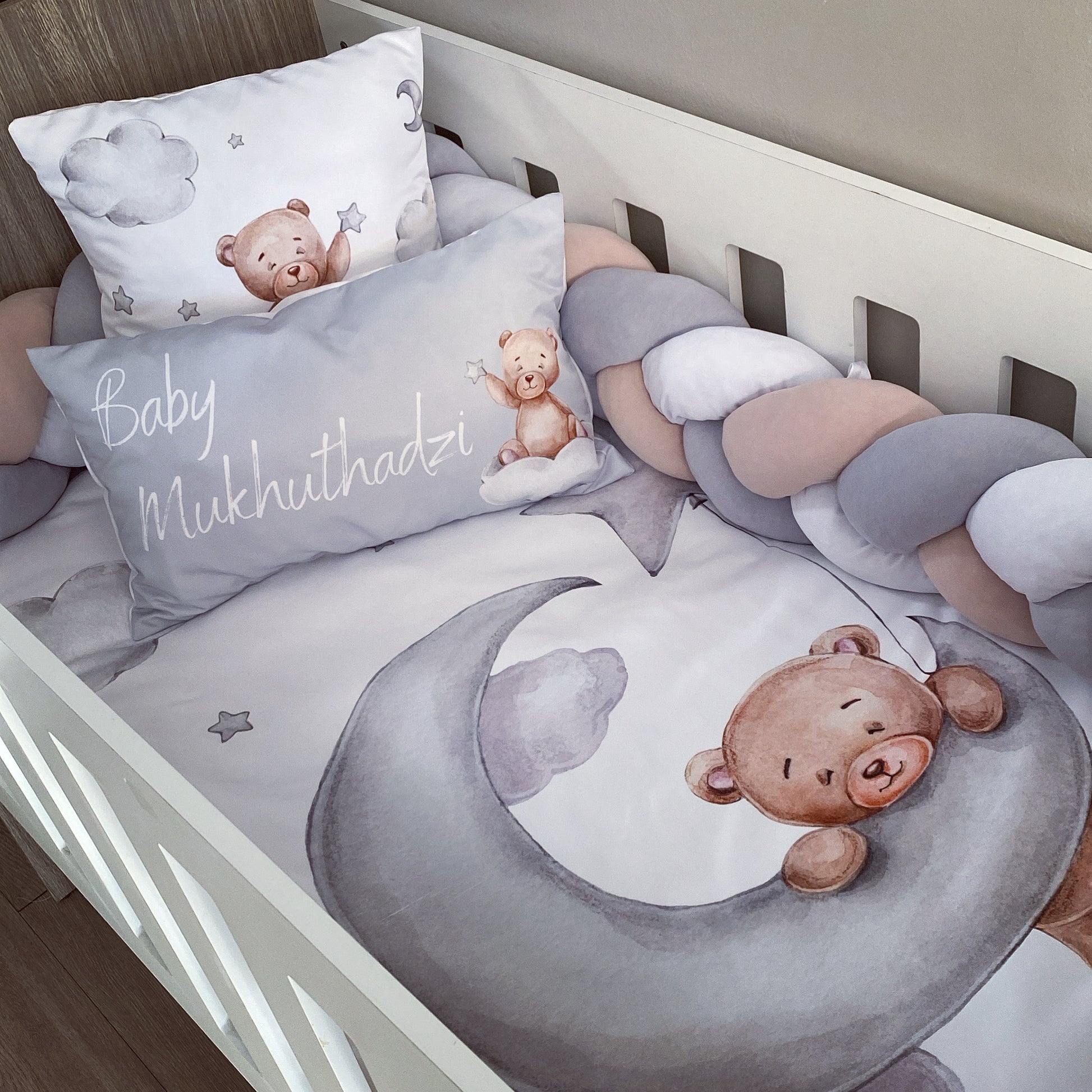 The Nursery Set: Standard Duvet Cover & Inner (80 x 110cm) | 2,5m Braided Bumper | Cot Pillow Cover & Inner | Scatter Cover & Inner | Name Pillow Cover & Inner | Change Mat Cover & Inner | Steel Frame or Wooden Frame | Set of 4 Dangles | White Fitted Sheet