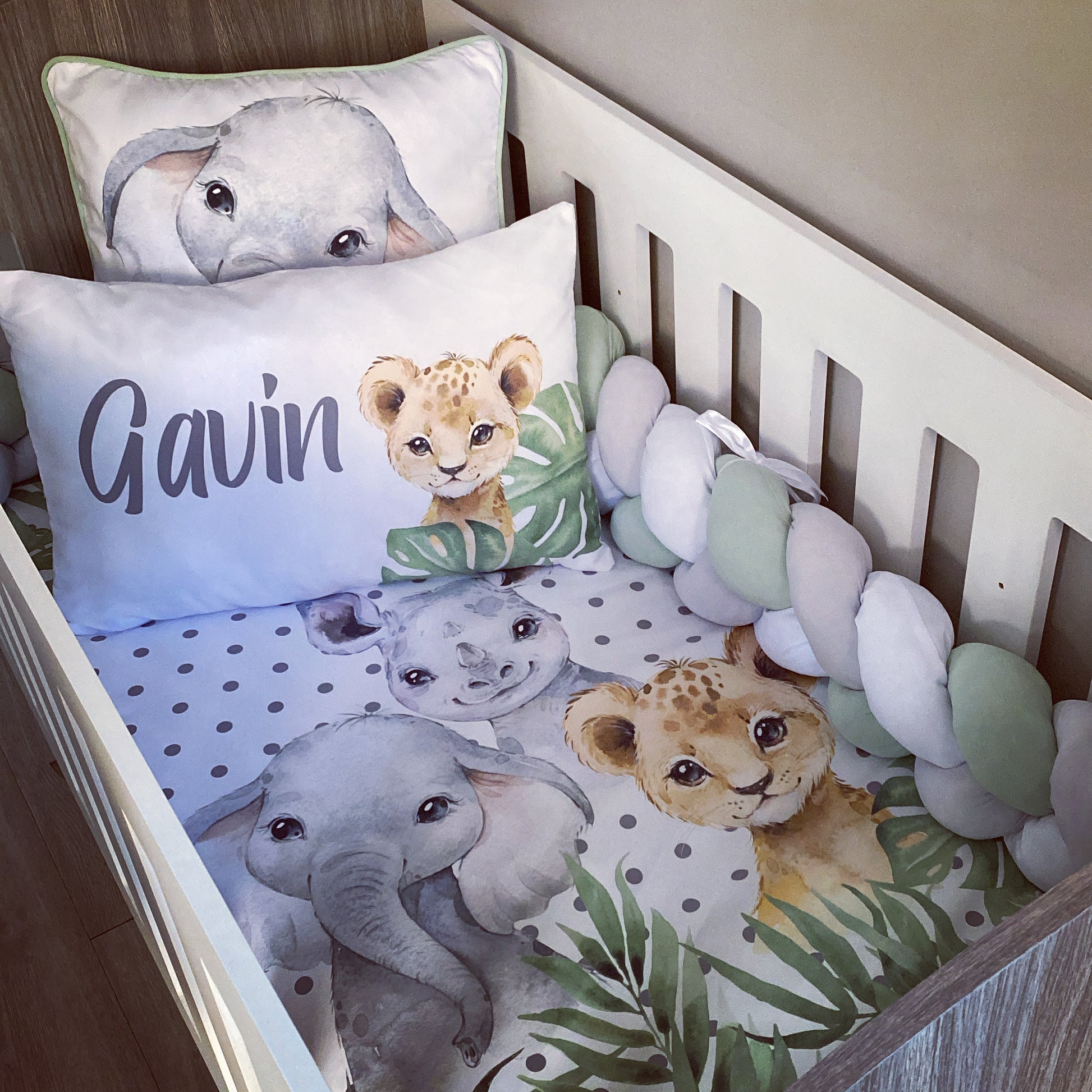 The Nursery Set: Standard Duvet Cover & Inner (80 x 110cm) | 2,5m Braided Bumper | Cot Pillow Cover & Inner | Scatter Cover & Inner | Name Pillow Cover & Inner | Change Mat Cover & Inner | Steel Frame or Wooden Frame | Set of 4 Dangles | White Fitted Sheet
