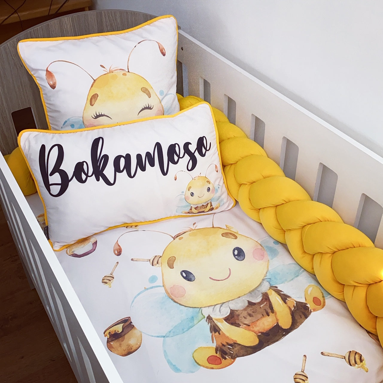 The Nursery Set: Standard Duvet Cover & Inner (80 x 110cm) | 2,5m Braided Bumper | Cot Pillow Cover & Inner | Scatter Cover & Inner | Name Pillow Cover & Inner | Change Mat Cover & Inner | Steel Frame or Wooden Frame | Set of 4 Dangles | White Fitted Sheet
