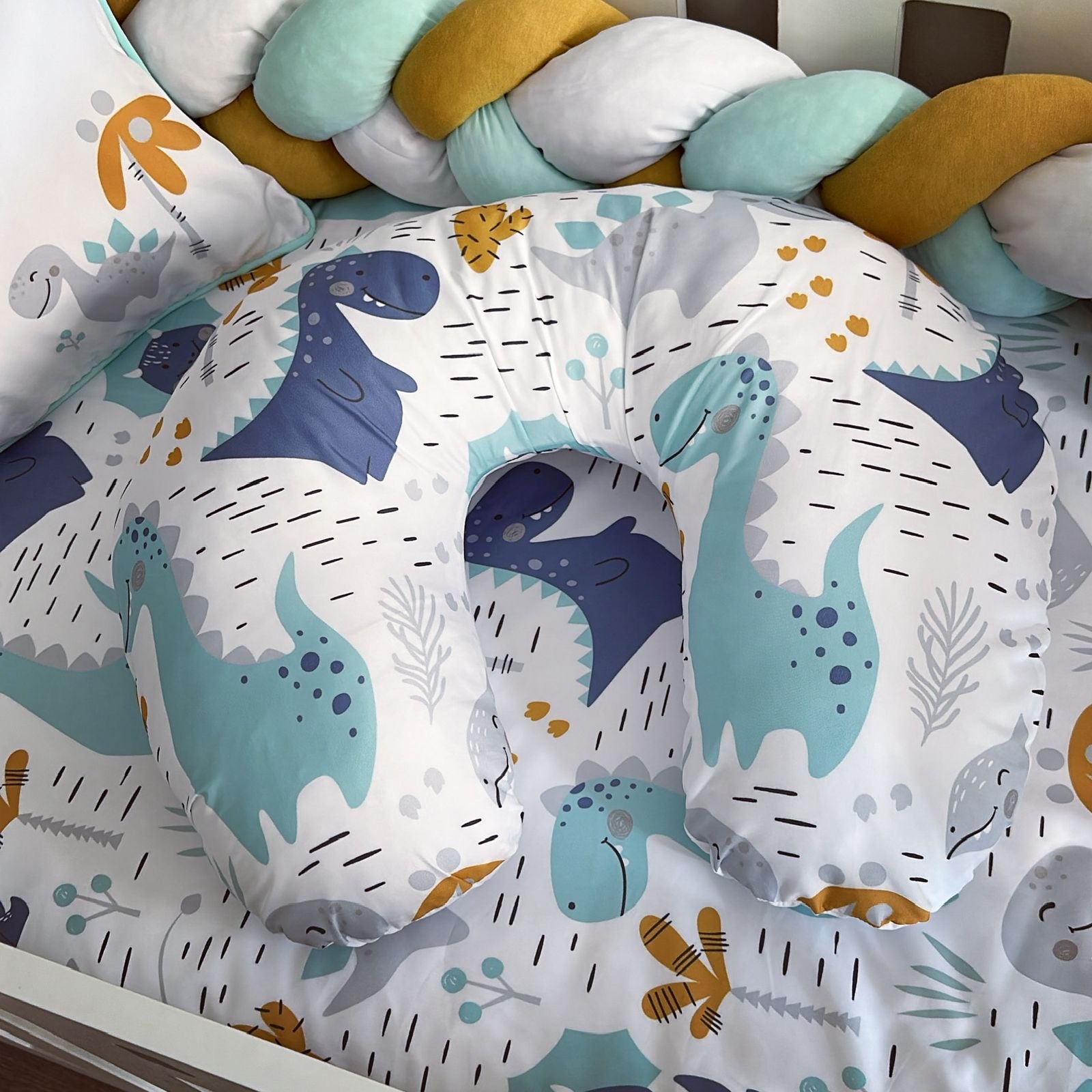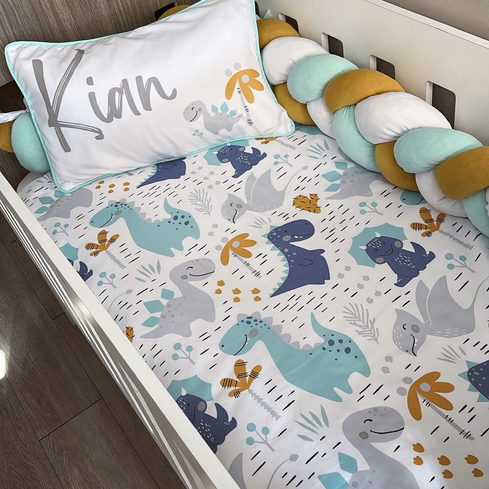The Nursery Set: Standard Duvet Cover & Inner (80 x 110cm) | 2,5m Braided Bumper | Cot Pillow Cover & Inner | Scatter Cover & Inner | Name Pillow Cover & Inner | Change Mat Cover & Inner | Steel Frame or Wooden Frame | Set of 4 Dangles | White Fitted Sheet