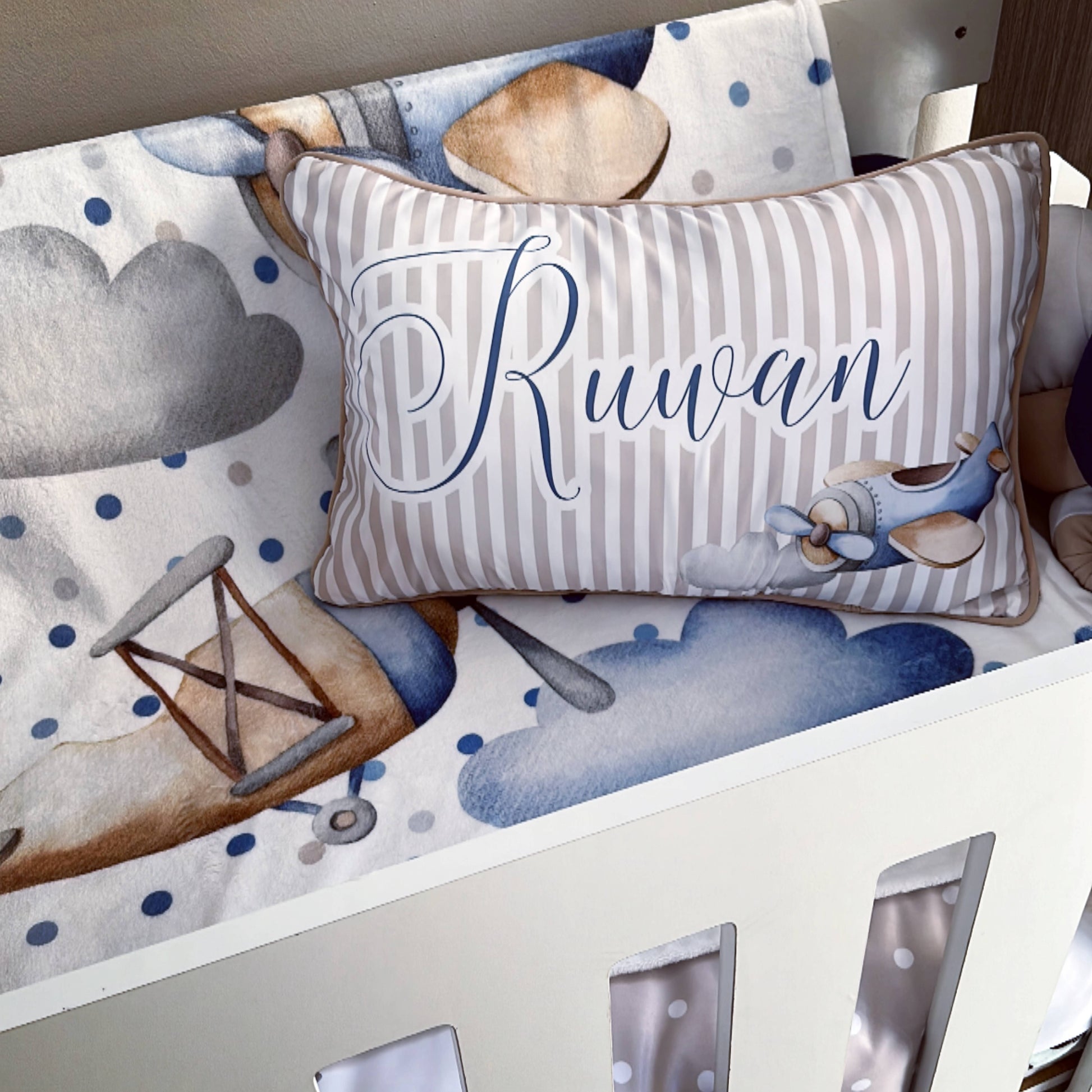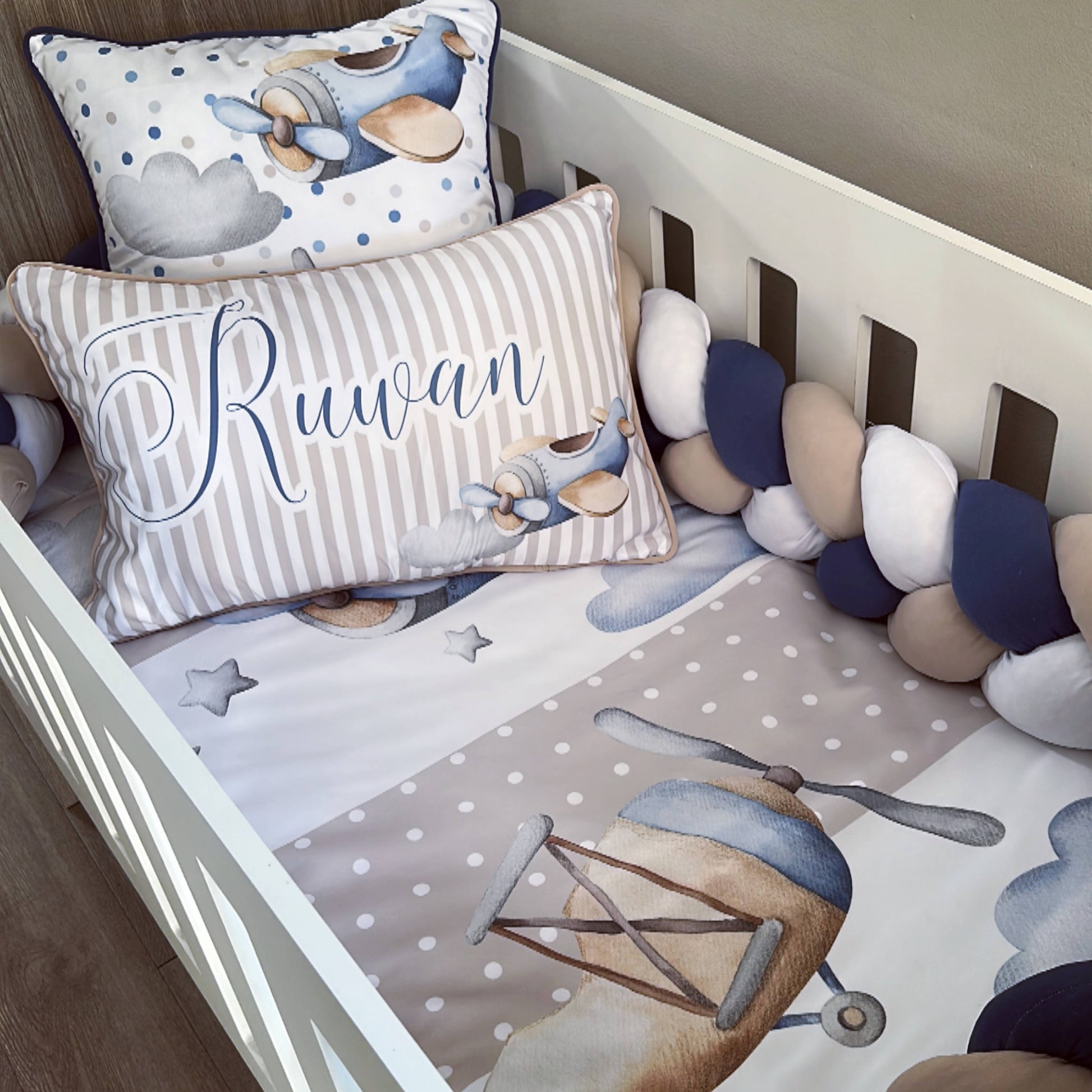The Standard Set: Standard Duvet Cover & Inner (80 x 110cm) | 2,5m Braided Bumper | Cot Pillow Cover & Inner | Scatter Cover & Inner | Name Pillow Cover & Inner | White Fitted Sheet