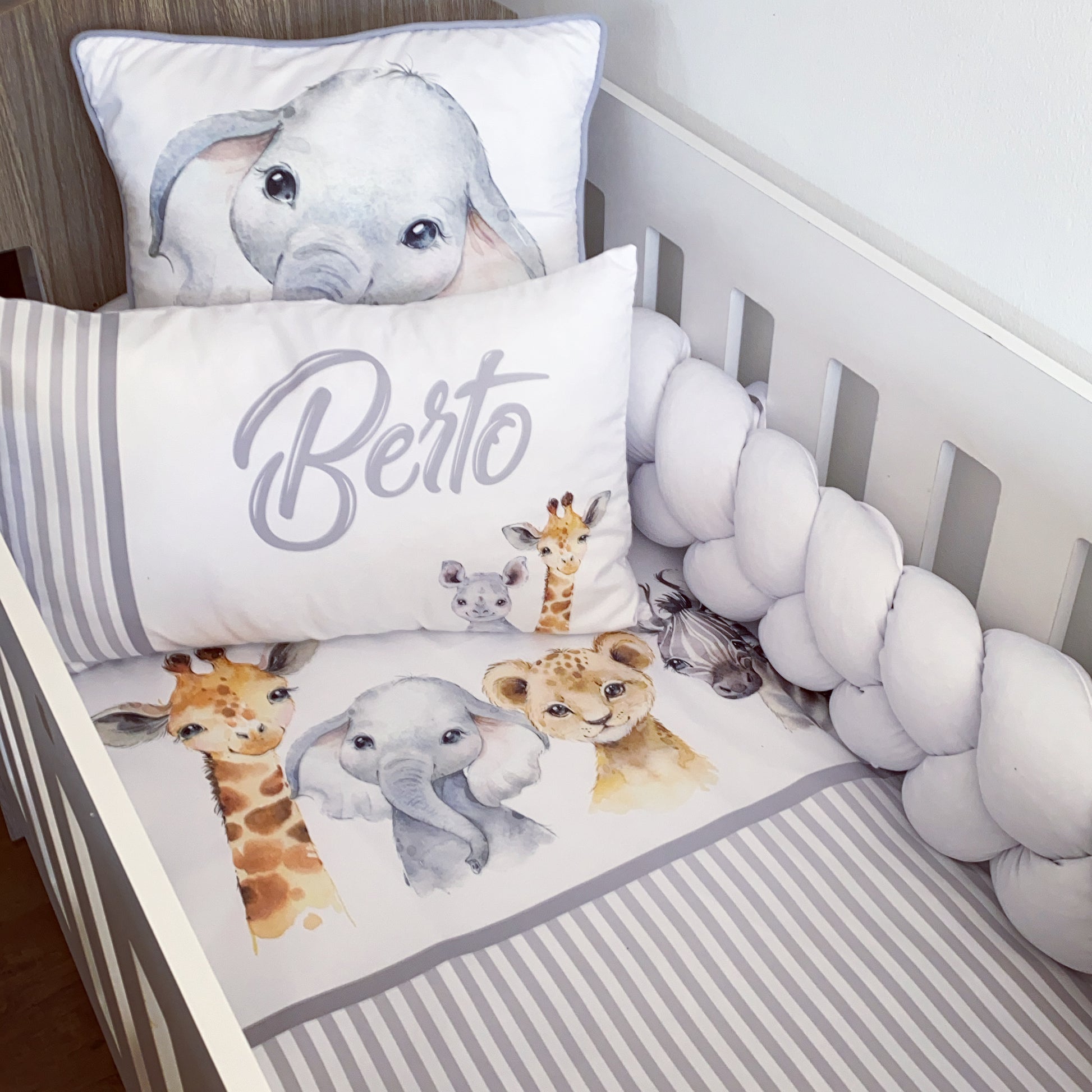 The Standard Set: Standard Duvet Cover & Inner (80 x 110cm) | 2,5m Braided Bumper | Cot Pillow Cover & Inner | Scatter Cover & Inner | Name Pillow Cover & Inner | White Fitted Sheet