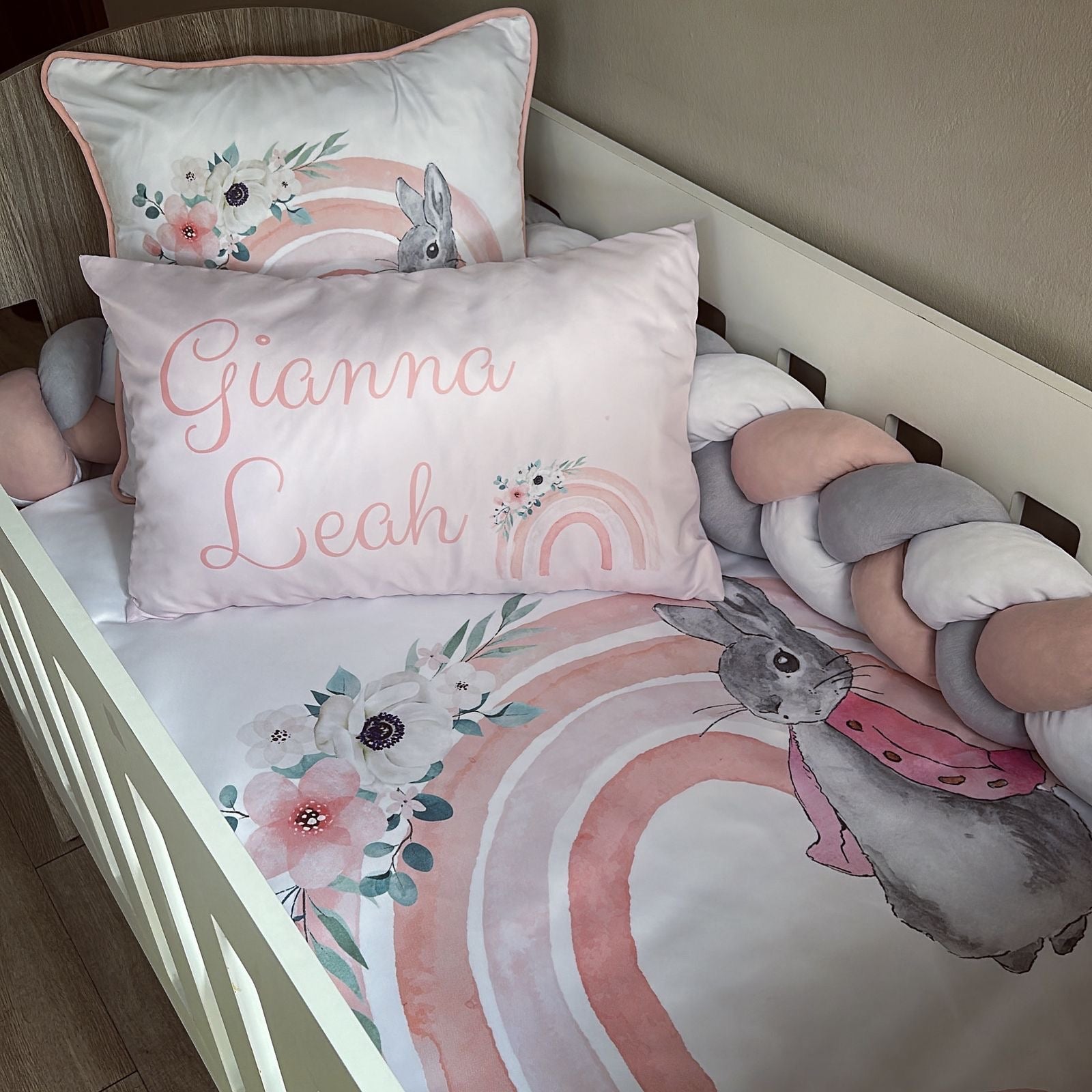 The Standard Set: Standard Duvet Cover & Inner (80 x 110cm) | 2,5m Braided Bumper | Cot Pillow Cover & Inner | Scatter Cover & Inner | Name Pillow Cover & Inner | White Fitted Sheet