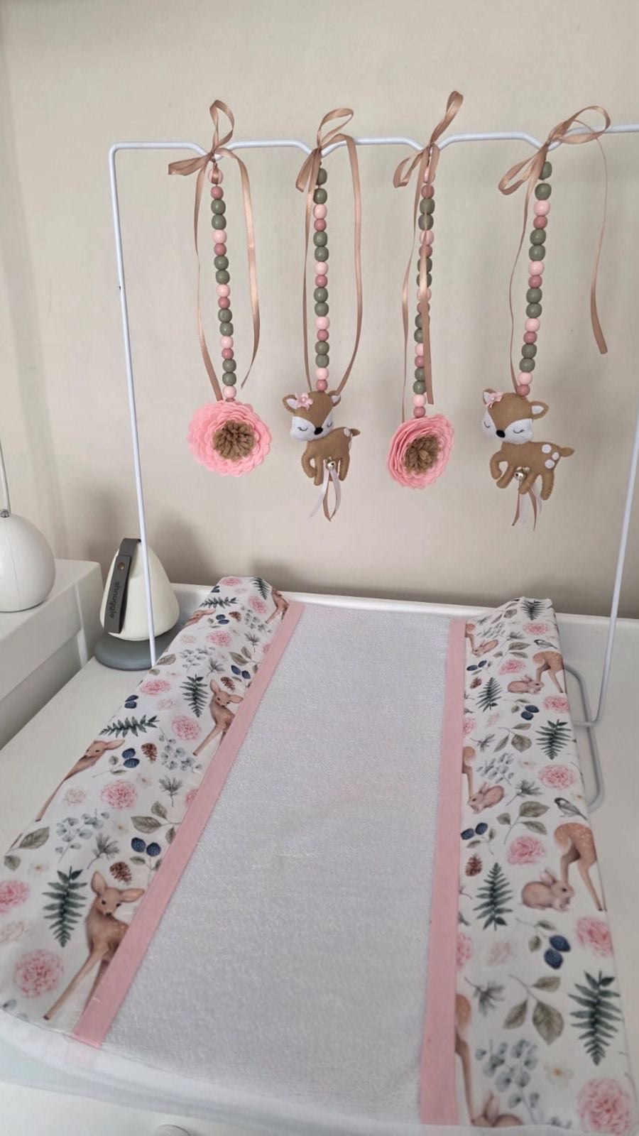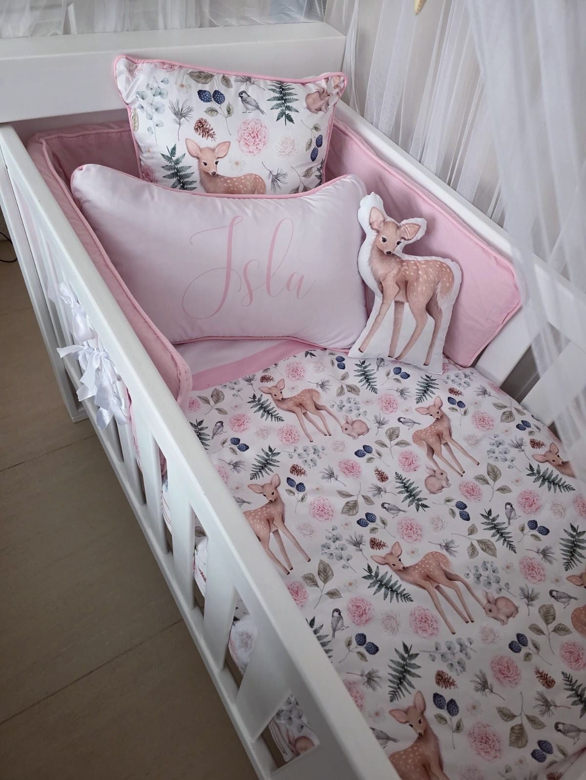 The Nursery Set: Standard Duvet Cover & Inner (80 x 110cm) | 2,5m Braided Bumper | Cot Pillow Cover & Inner | Scatter Cover & Inner | Name Pillow Cover & Inner | Change Mat Cover & Inner | Steel Frame or Wooden Frame | Set of 4 Dangles | White Fitted Sheet