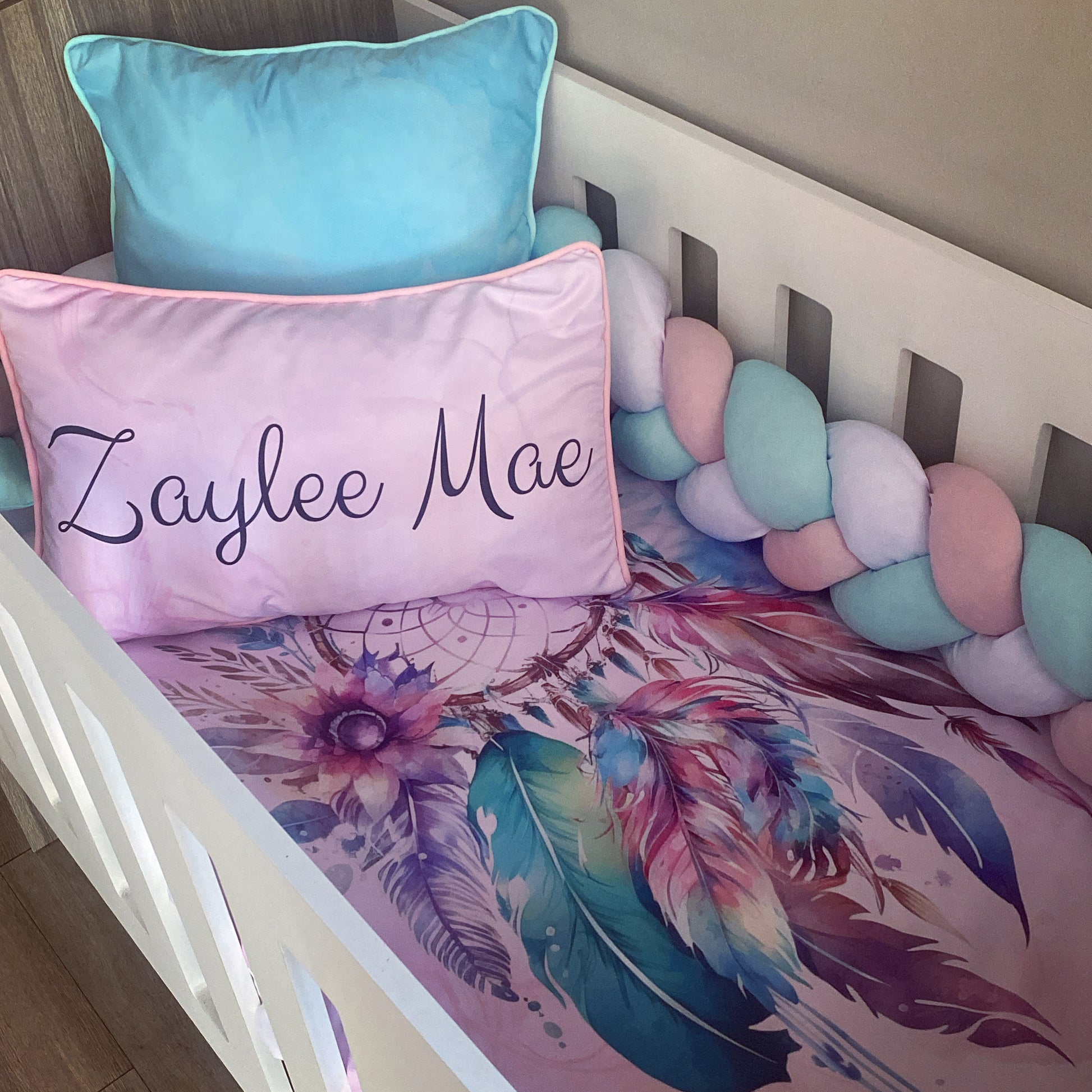 The Standard Set: Standard Duvet Cover & Inner (80 x 110cm) | 2,5m Braided Bumper | Cot Pillow Cover & Inner | Scatter Cover & Inner | Name Pillow Cover & Inner | White Fitted Sheet