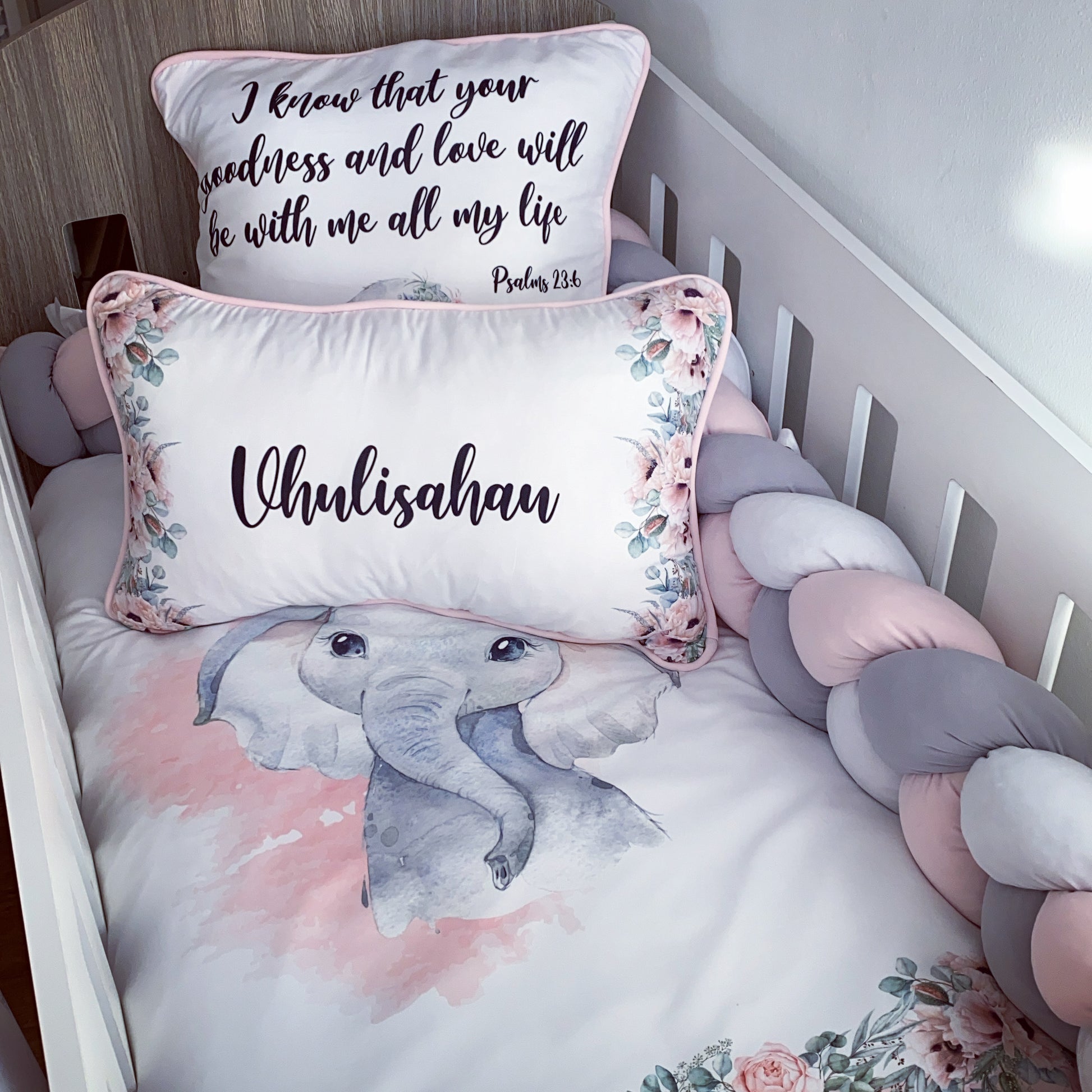 The Nursery Set: Standard Duvet Cover & Inner (80 x 110cm) | 2,5m Braided Bumper | Cot Pillow Cover & Inner | Scatter Cover & Inner | Name Pillow Cover & Inner | Change Mat Cover & Inner | Steel Frame or Wooden Frame | Set of 4 Dangles | White Fitted Sheet