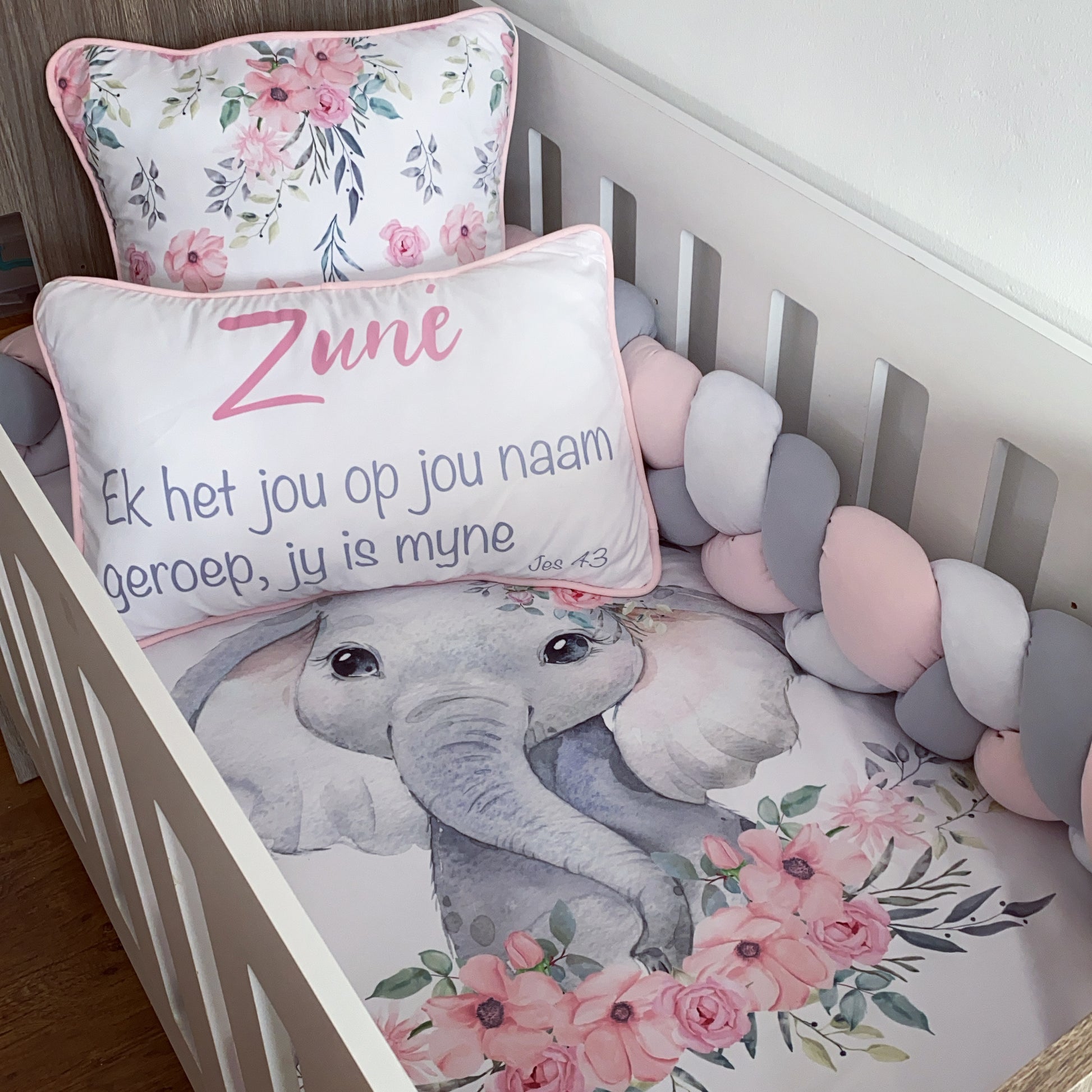 The Nursery Set: Standard Duvet Cover & Inner (80 x 110cm) | 2,5m Braided Bumper | Cot Pillow Cover & Inner | Scatter Cover & Inner | Name Pillow Cover & Inner | Change Mat Cover & Inner | Steel Frame or Wooden Frame | Set of 4 Dangles | White Fitted Sheet