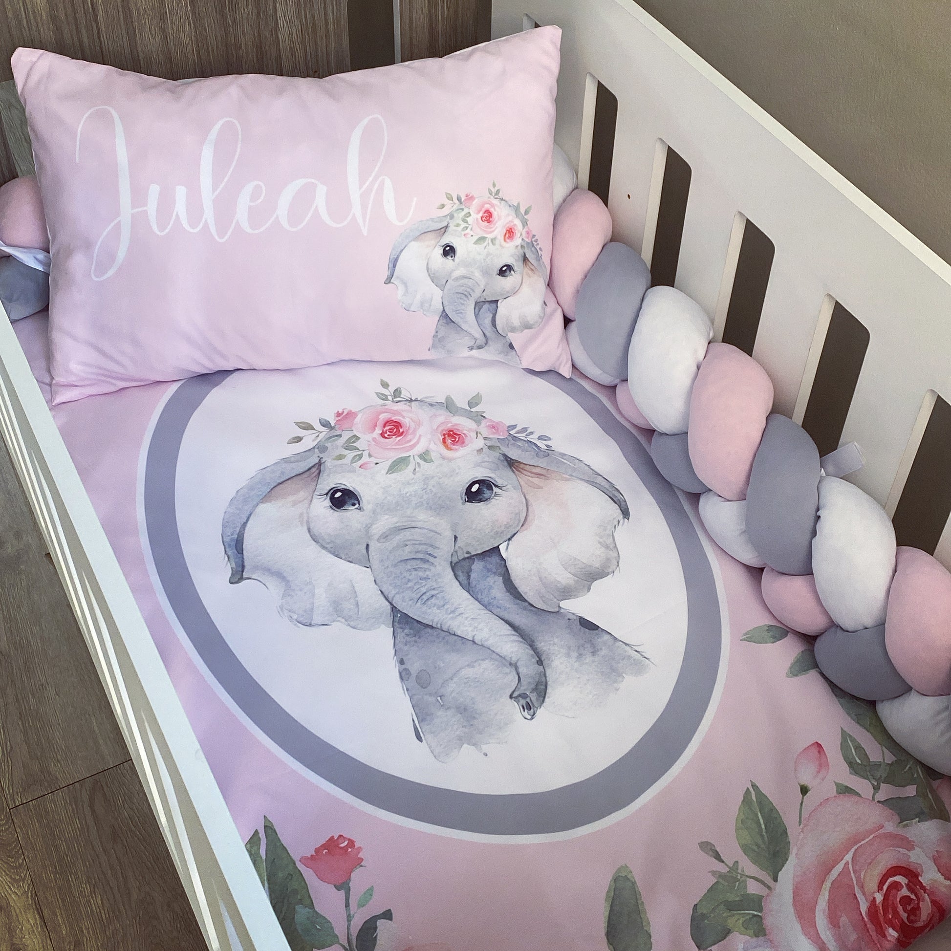 The Nursery Set: Standard Duvet Cover & Inner (80 x 110cm) | 2,5m Braided Bumper | Cot Pillow Cover & Inner | Scatter Cover & Inner | Name Pillow Cover & Inner | Change Mat Cover & Inner | Steel Frame or Wooden Frame | Set of 4 Dangles | White Fitted Sheet