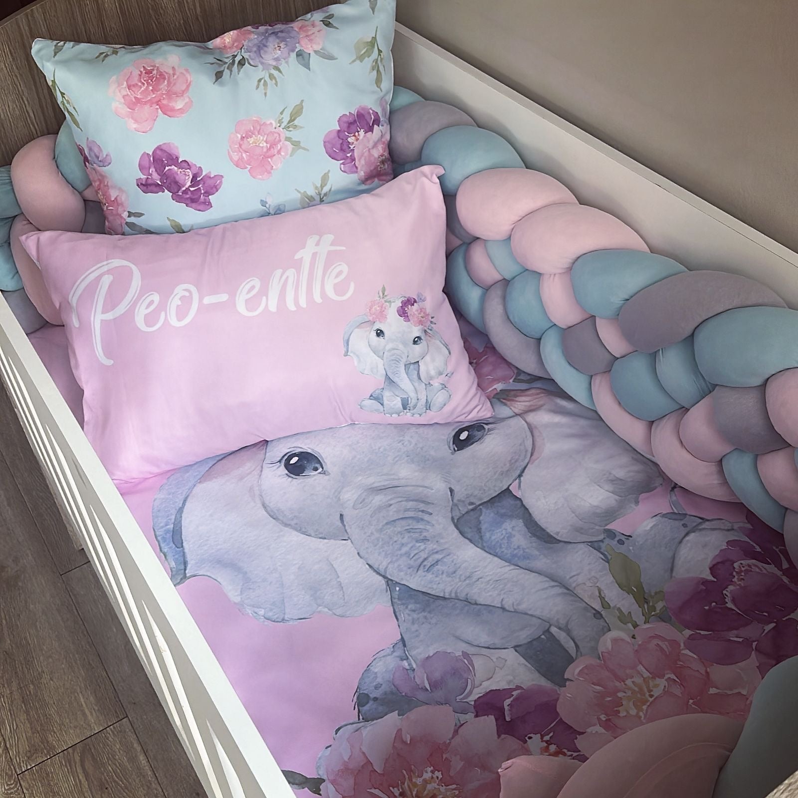 The Nursery Set: Standard Duvet Cover & Inner (80 x 110cm) | 2,5m Braided Bumper | Cot Pillow Cover & Inner | Scatter Cover & Inner | Name Pillow Cover & Inner | Change Mat Cover & Inner | Steel Frame or Wooden Frame | Set of 4 Dangles | White Fitted Sheet