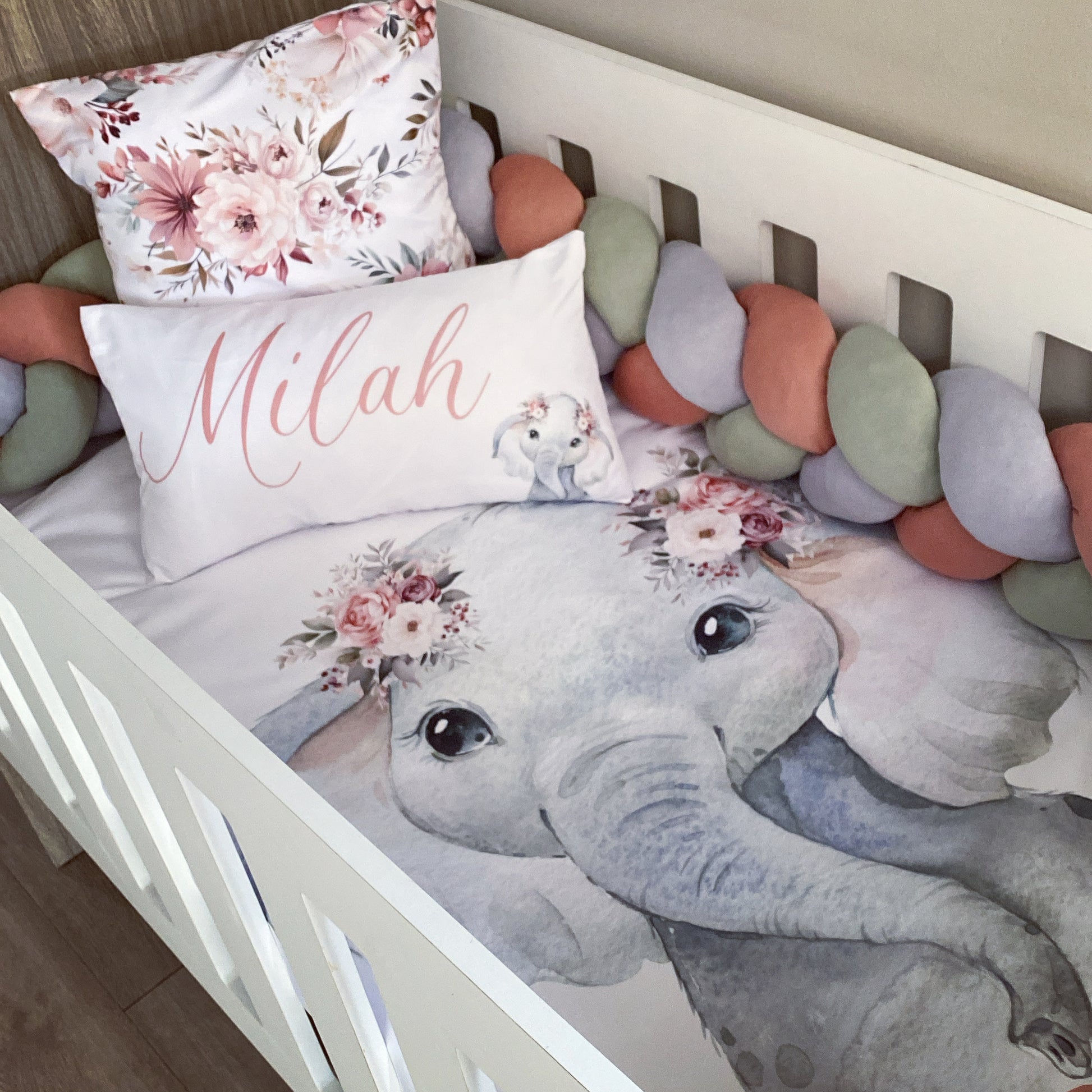 The Nursery Set: Standard Duvet Cover & Inner (80 x 110cm) | 2,5m Braided Bumper | Cot Pillow Cover & Inner | Scatter Cover & Inner | Name Pillow Cover & Inner | Change Mat Cover & Inner | Steel Frame or Wooden Frame | Set of 4 Dangles | White Fitted Sheet