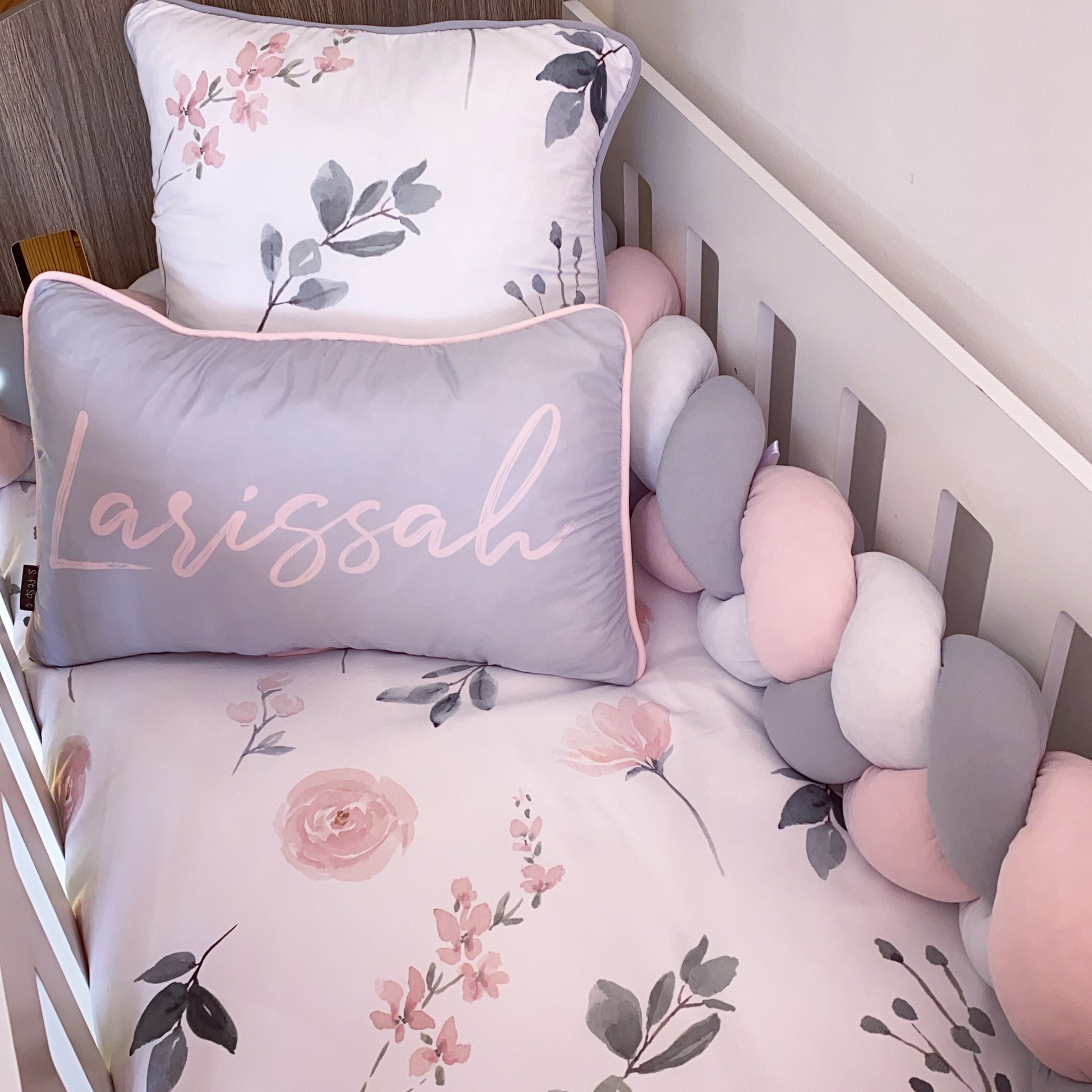 The Standard Set: Standard Duvet Cover & Inner (80 x 110cm) | 2,5m Braided Bumper | Cot Pillow Cover & Inner | Scatter Cover & Inner | Name Pillow Cover & Inner | White Fitted Sheet