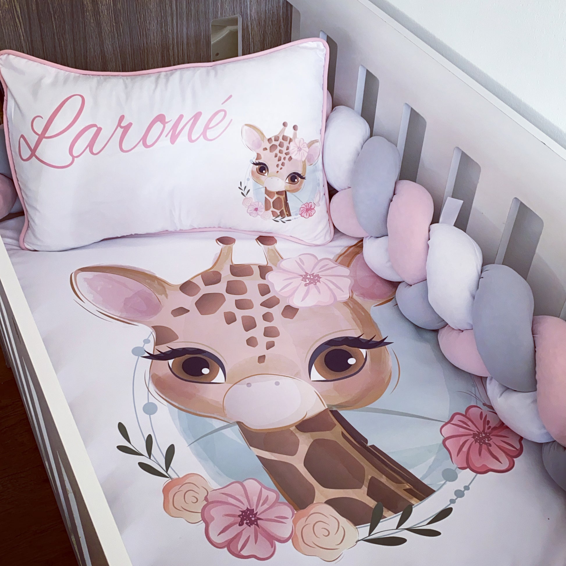 The Nursery Set: Standard Duvet Cover & Inner (80 x 110cm) | 2,5m Braided Bumper | Cot Pillow Cover & Inner | Scatter Cover & Inner | Name Pillow Cover & Inner | Change Mat Cover & Inner | Steel Frame or Wooden Frame | Set of 4 Dangles | White Fitted Sheet