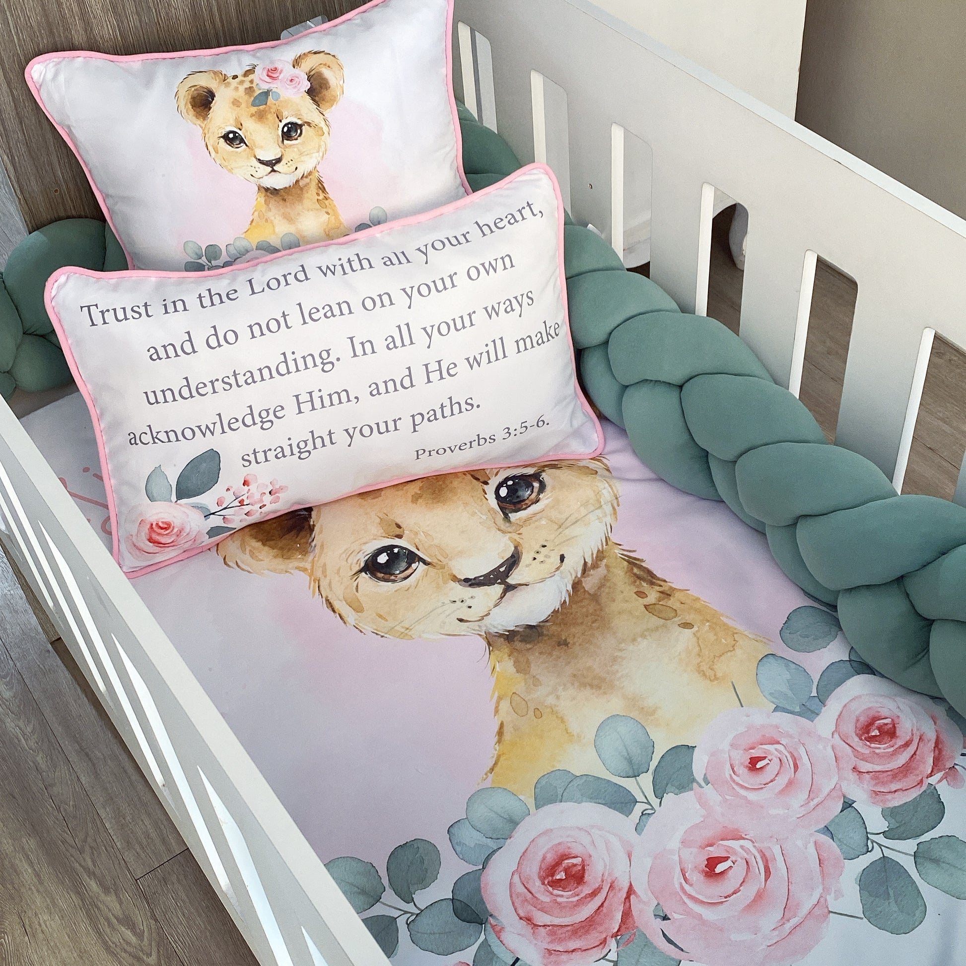 The Nursery Set: Standard Duvet Cover & Inner (80 x 110cm) | 2,5m Braided Bumper | Cot Pillow Cover & Inner | Scatter Cover & Inner | Name Pillow Cover & Inner | Change Mat Cover & Inner | Steel Frame or Wooden Frame | Set of 4 Dangles | White Fitted Sheet