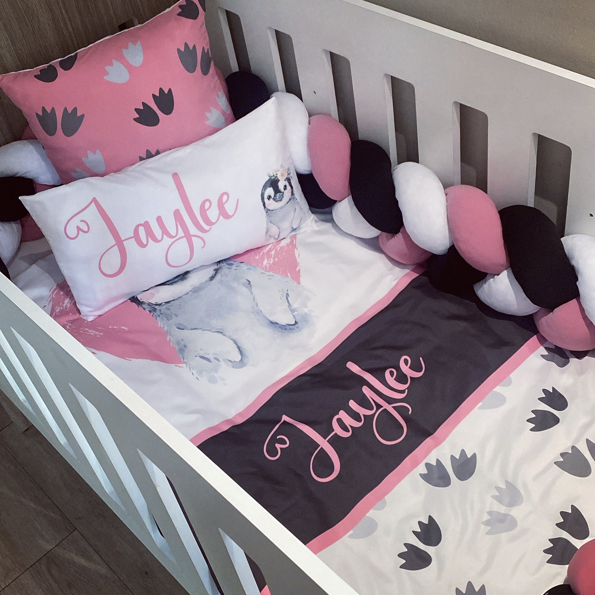 The Nursery Set: Standard Duvet Cover & Inner (80 x 110cm) | 2,5m Braided Bumper | Cot Pillow Cover & Inner | Scatter Cover & Inner | Name Pillow Cover & Inner | Change Mat Cover & Inner | Steel Frame or Wooden Frame | Set of 4 Dangles | White Fitted Sheet