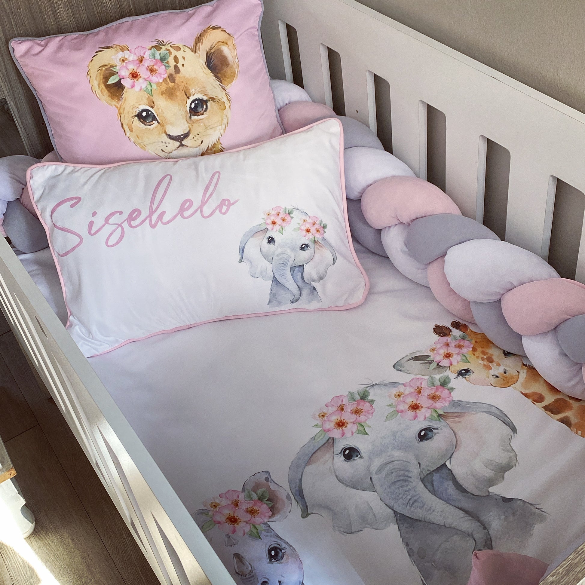 The Nursery Set: Standard Duvet Cover & Inner (80 x 110cm) | 2,5m Braided Bumper | Cot Pillow Cover & Inner | Scatter Cover & Inner | Name Pillow Cover & Inner | Change Mat Cover & Inner | Steel Frame or Wooden Frame | Set of 4 Dangles | White Fitted Sheet