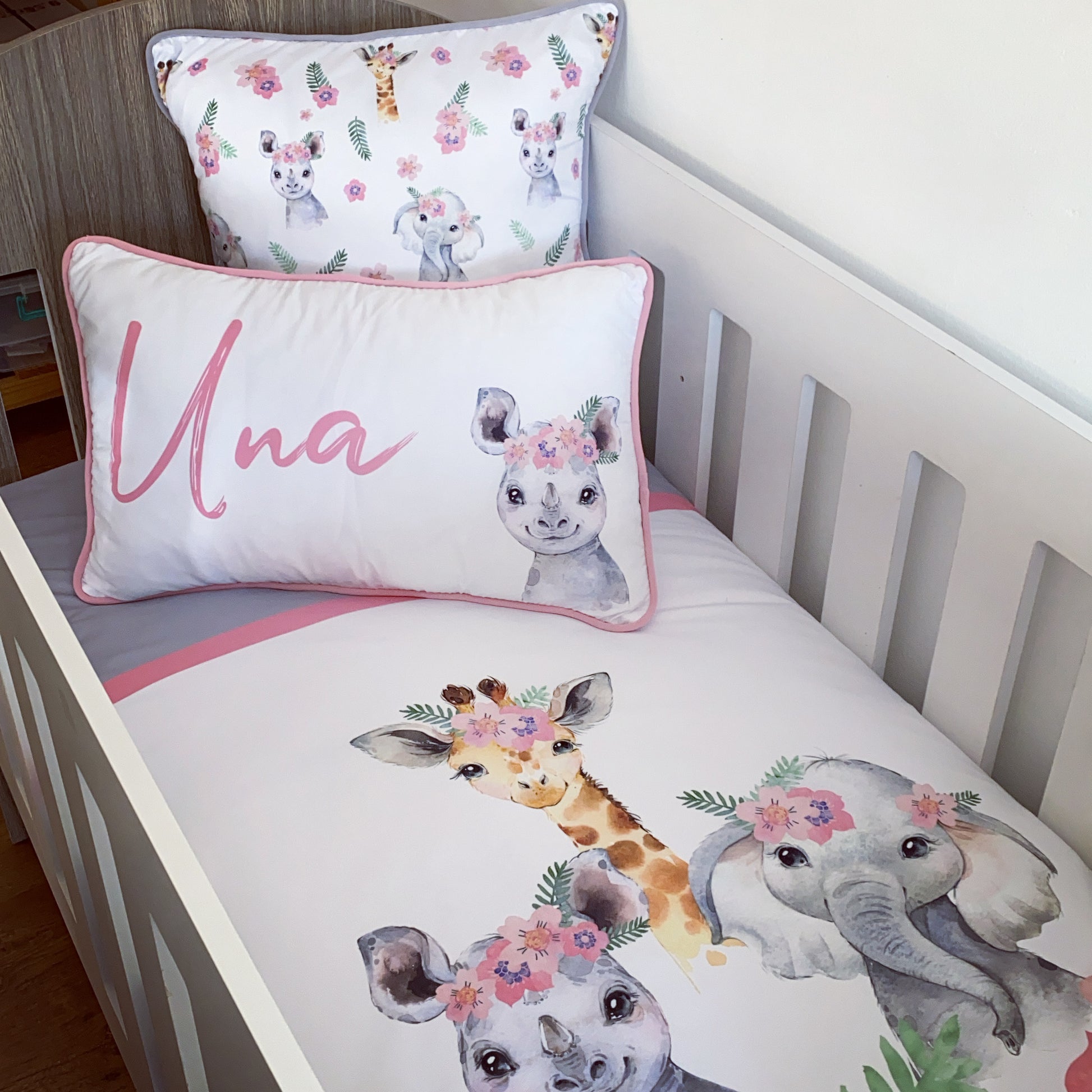 The Camping Cot Set: Standard Duvet Cover & Inner (80 x 110cm) | Cot Pillow Cover & Inner | Scatter Cover & Inner | Name Pillow Cover & Inner | White Fitted Sheet
