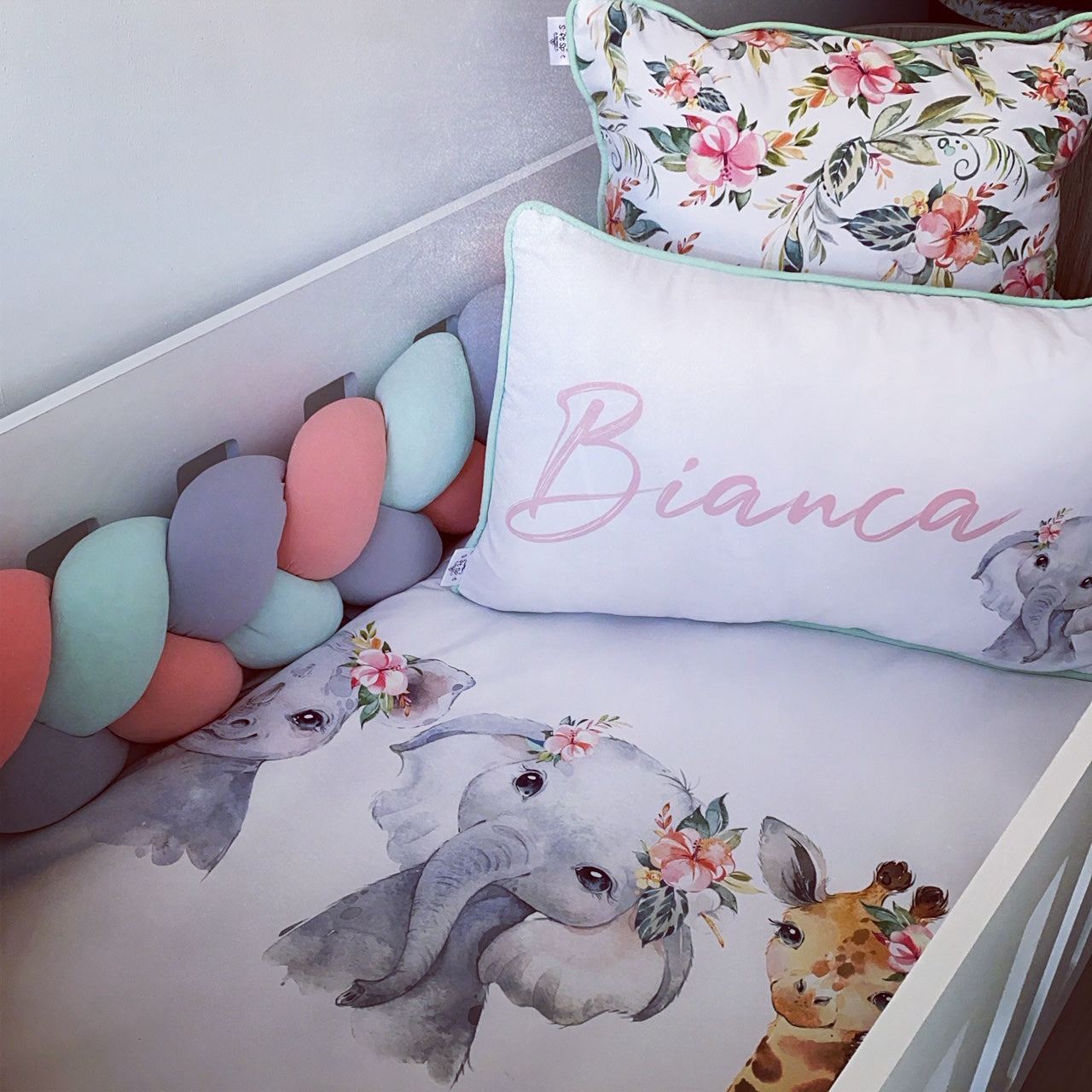 The Nursery Set: Standard Duvet Cover & Inner (80 x 110cm) | 2,5m Braided Bumper | Cot Pillow Cover & Inner | Scatter Cover & Inner | Name Pillow Cover & Inner | Change Mat Cover & Inner | Steel Frame or Wooden Frame | Set of 4 Dangles | White Fitted Sheet