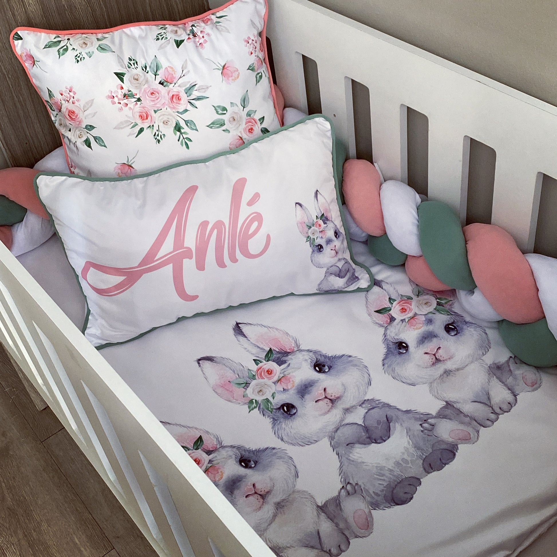 The Nursery Set: Standard Duvet Cover & Inner (80 x 110cm) | 2,5m Braided Bumper | Cot Pillow Cover & Inner | Scatter Cover & Inner | Name Pillow Cover & Inner | Change Mat Cover & Inner | Steel Frame or Wooden Frame | Set of 4 Dangles | White Fitted Sheet