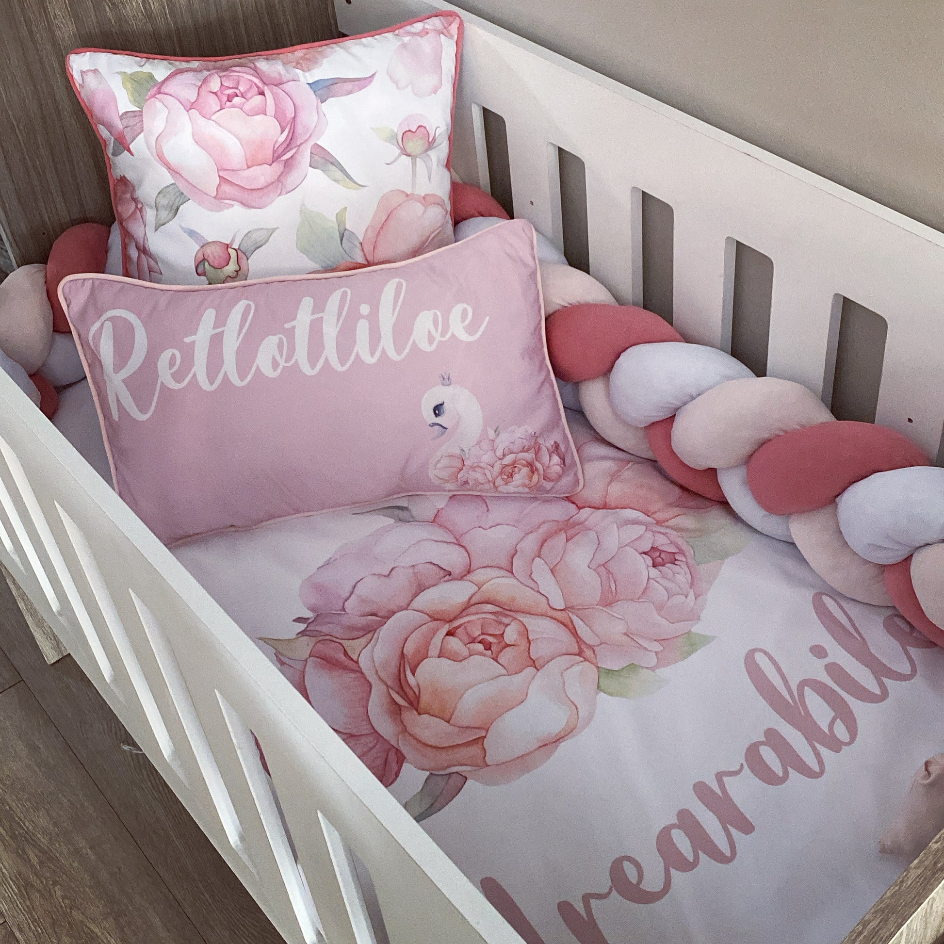 The Nursery Set: Standard Duvet Cover & Inner (80 x 110cm) | 2,5m Braided Bumper | Cot Pillow Cover & Inner | Scatter Cover & Inner | Name Pillow Cover & Inner | Change Mat Cover & Inner | Steel Frame or Wooden Frame | Set of 4 Dangles | White Fitted Sheet