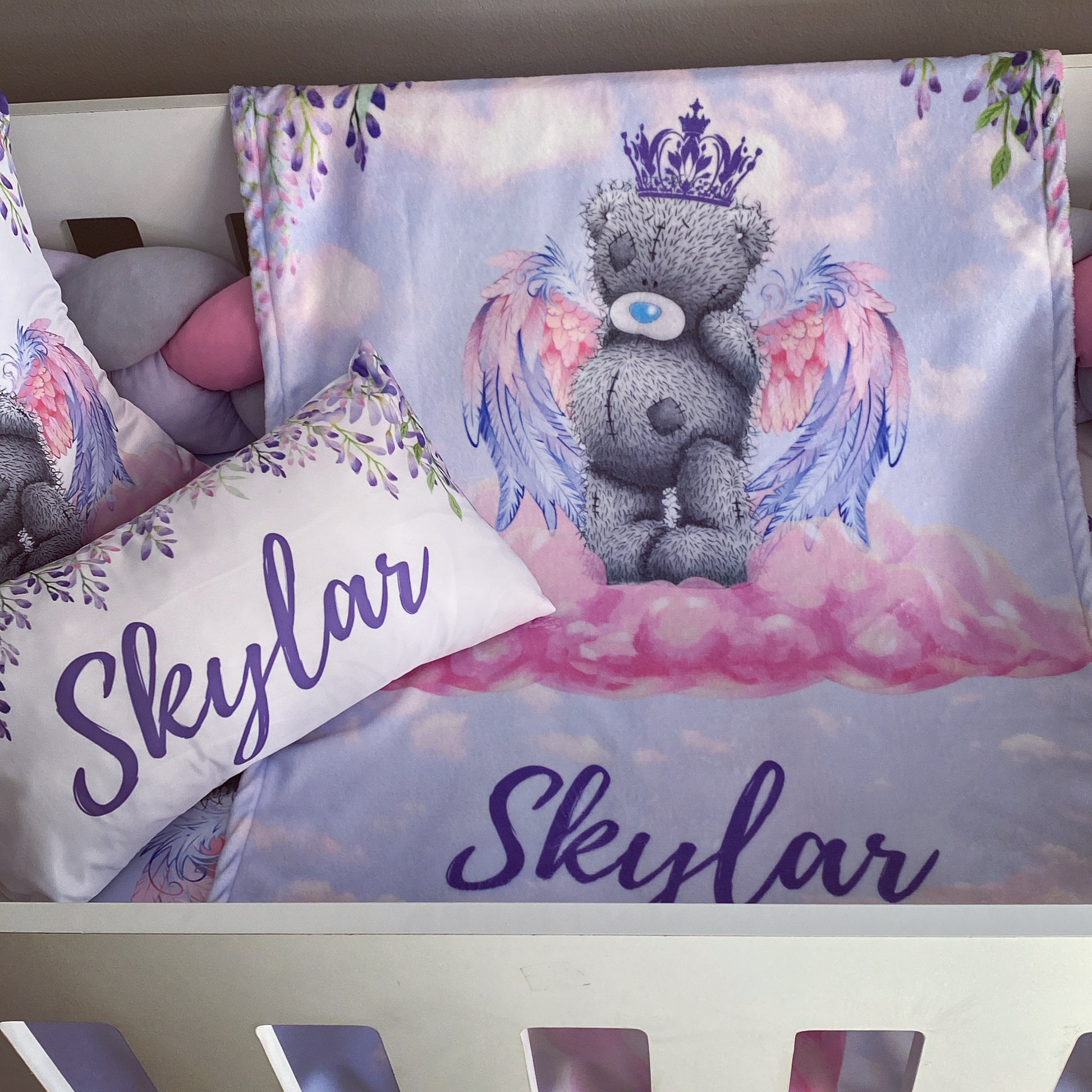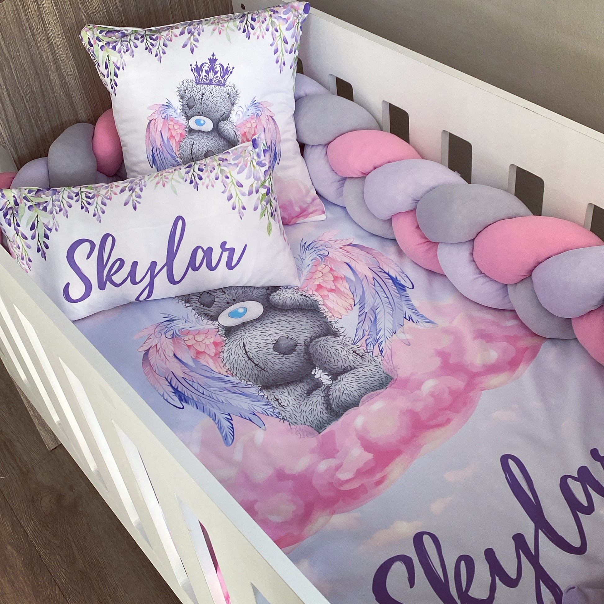 The Nursery Set: Standard Duvet Cover & Inner (80 x 110cm) | 2,5m Braided Bumper | Cot Pillow Cover & Inner | Scatter Cover & Inner | Name Pillow Cover & Inner | Change Mat Cover & Inner | Steel Frame or Wooden Frame | Set of 4 Dangles | White Fitted Sheet