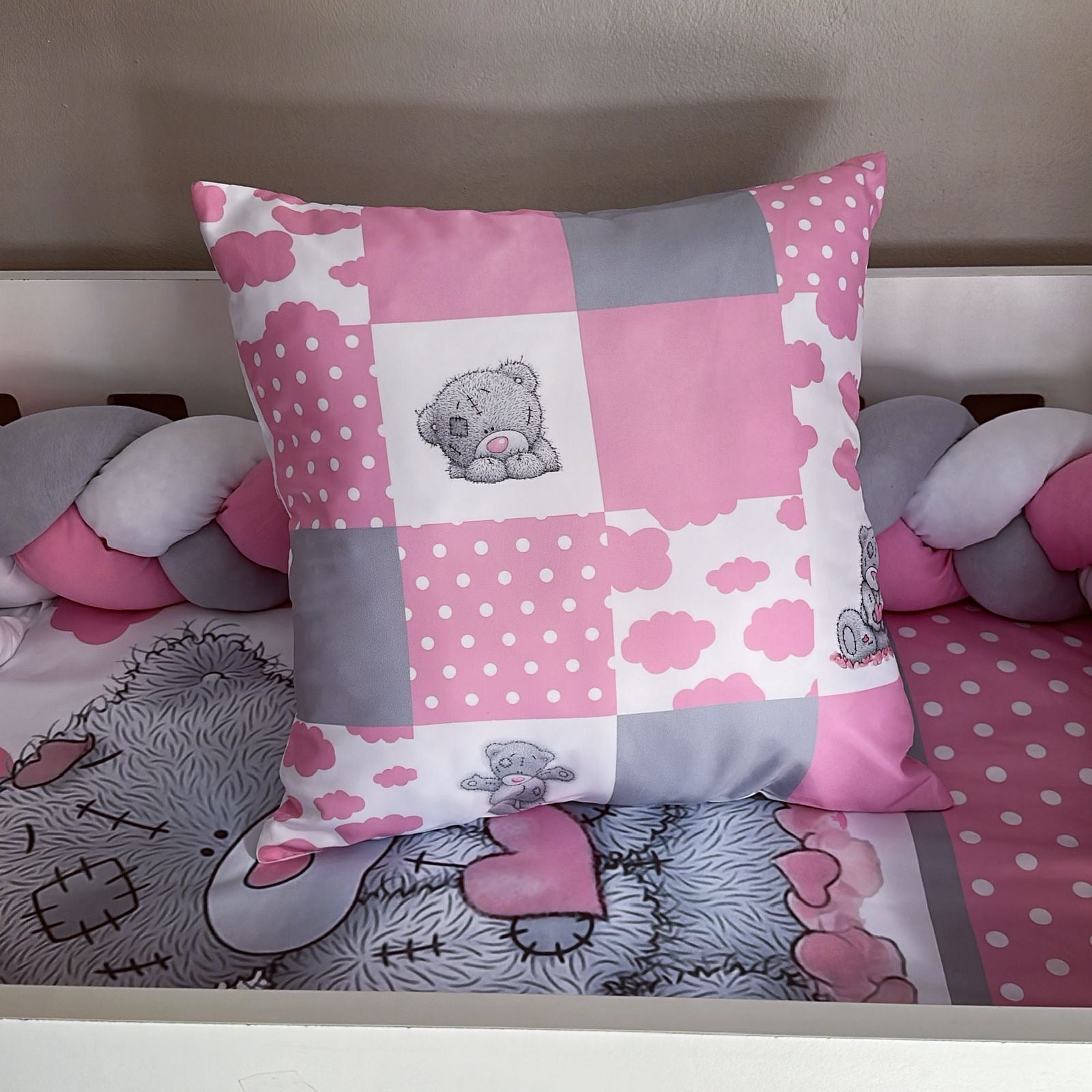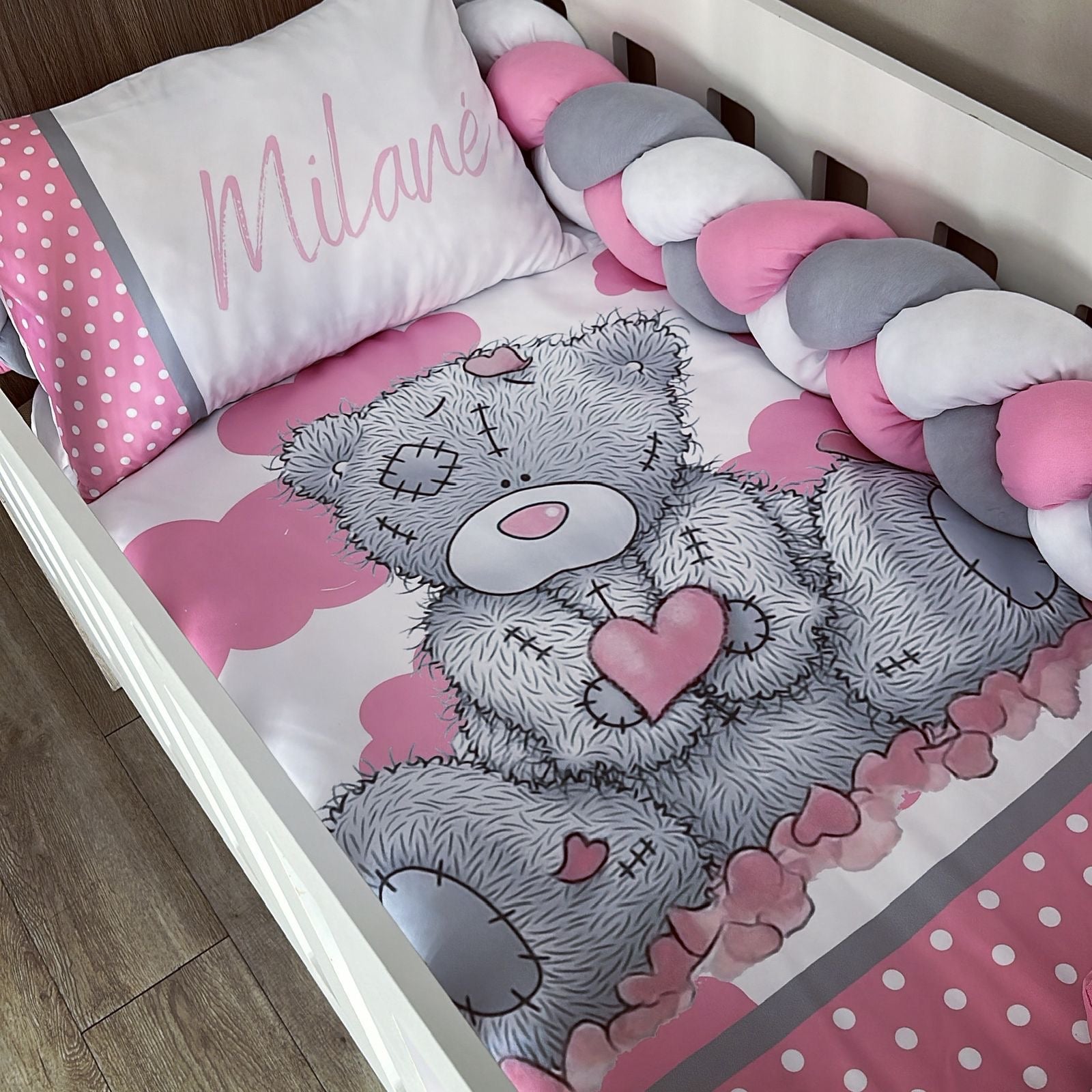 The Nursery Set: Standard Duvet Cover & Inner (80 x 110cm) | 2,5m Braided Bumper | Cot Pillow Cover & Inner | Scatter Cover & Inner | Name Pillow Cover & Inner | Change Mat Cover & Inner | Steel Frame or Wooden Frame | Set of 4 Dangles | White Fitted Sheet