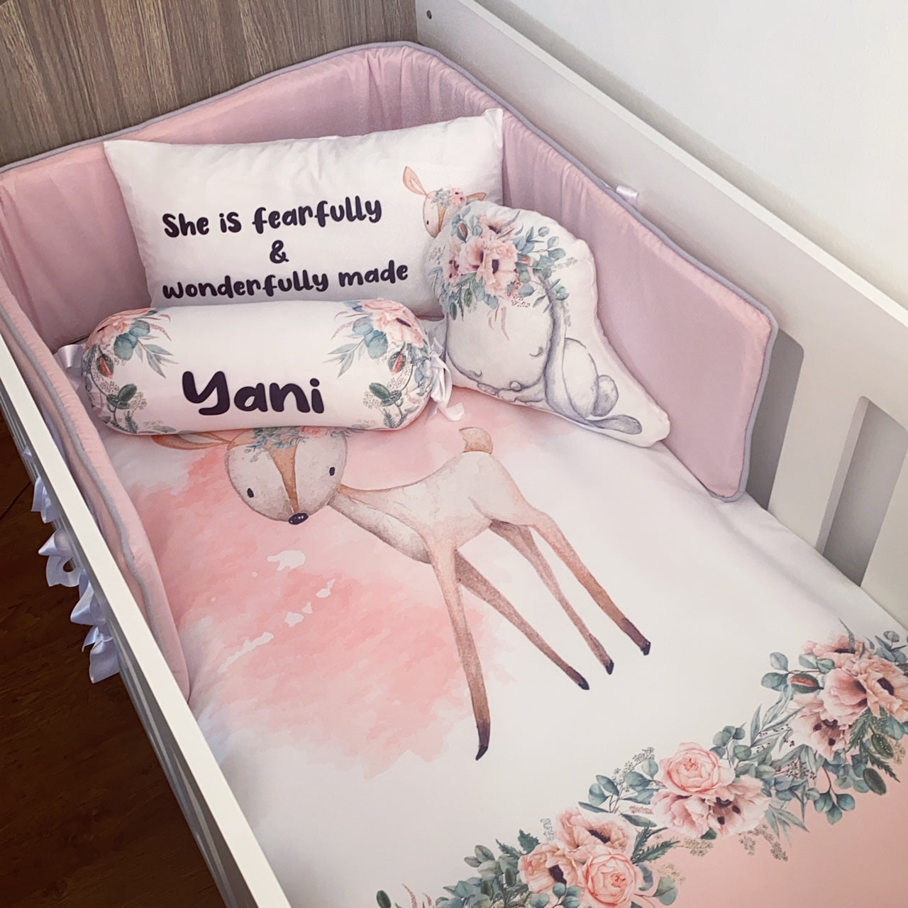 The Nursery Set: Standard Duvet Cover & Inner (80 x 110cm) | 2,5m Braided Bumper | Cot Pillow Cover & Inner | Scatter Cover & Inner | Name Pillow Cover & Inner | Change Mat Cover & Inner | Steel Frame or Wooden Frame | Set of 4 Dangles | White Fitted Sheet